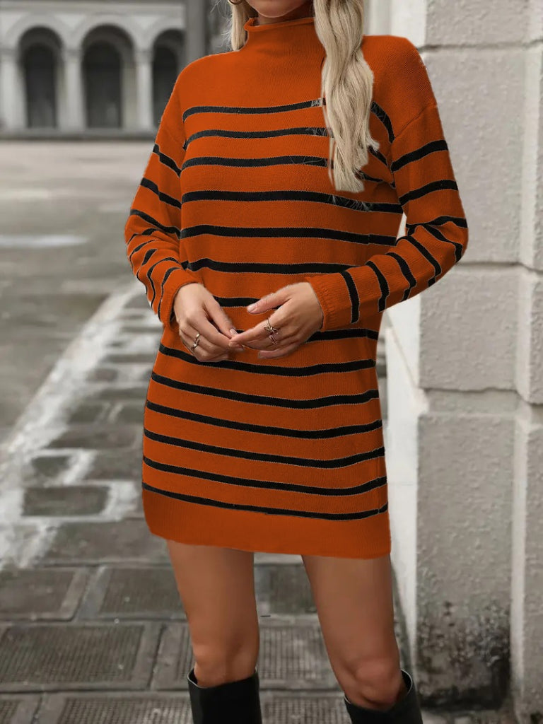 Kadın Uzun Kollu Yarım Balıkçı Yaka çizgilitriko Mini Boy Elbise (kemersiz)