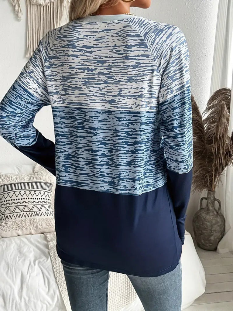 Kadın Uzun Kollu Yuvarlak Yaka Baskılı Düğme Detay Süprem Bluz