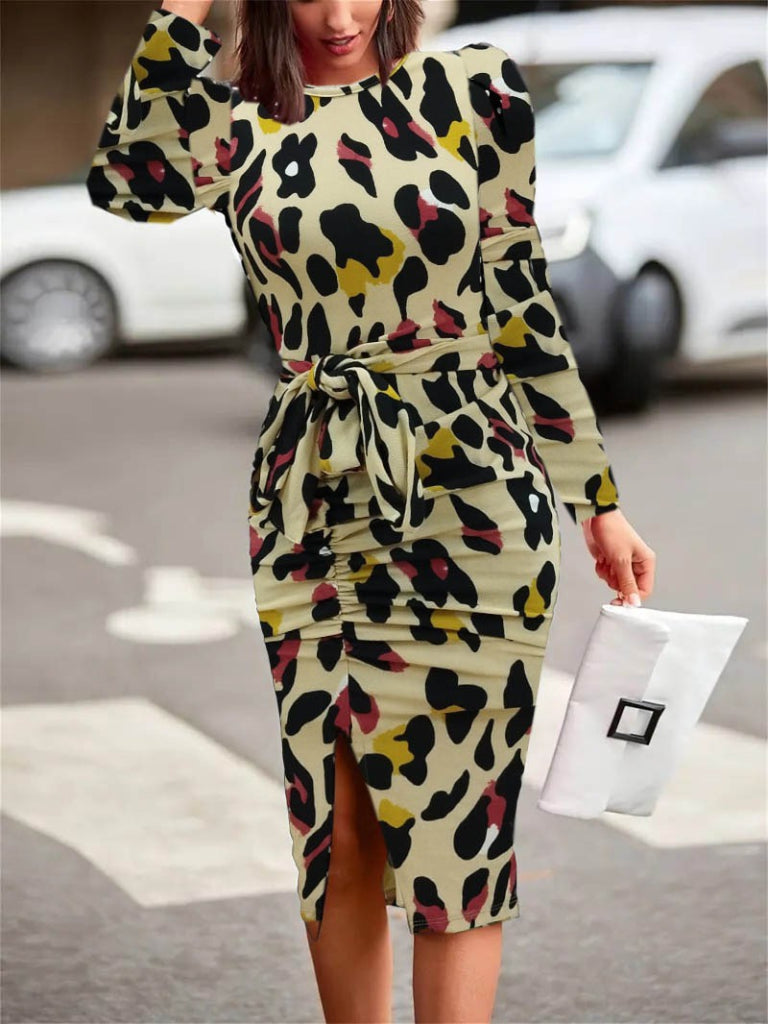 Kadın Uzun Kollu Yuvarlak Yaka Belden Kuşaklı önden Yırtmaçlı örme Krep Elbise