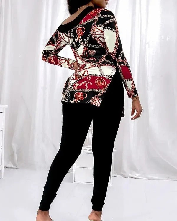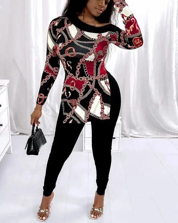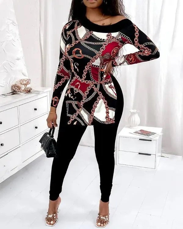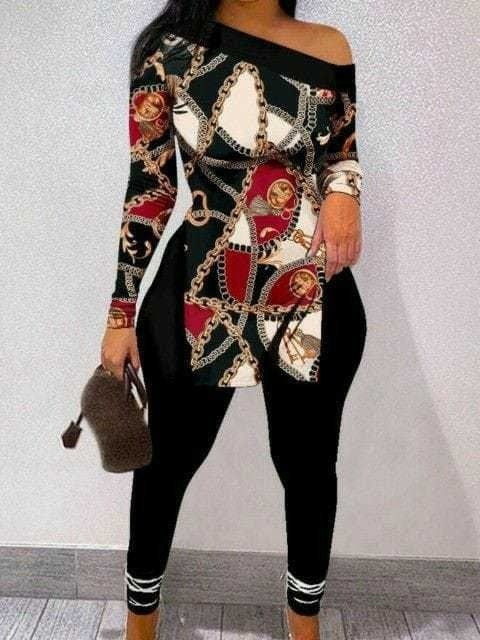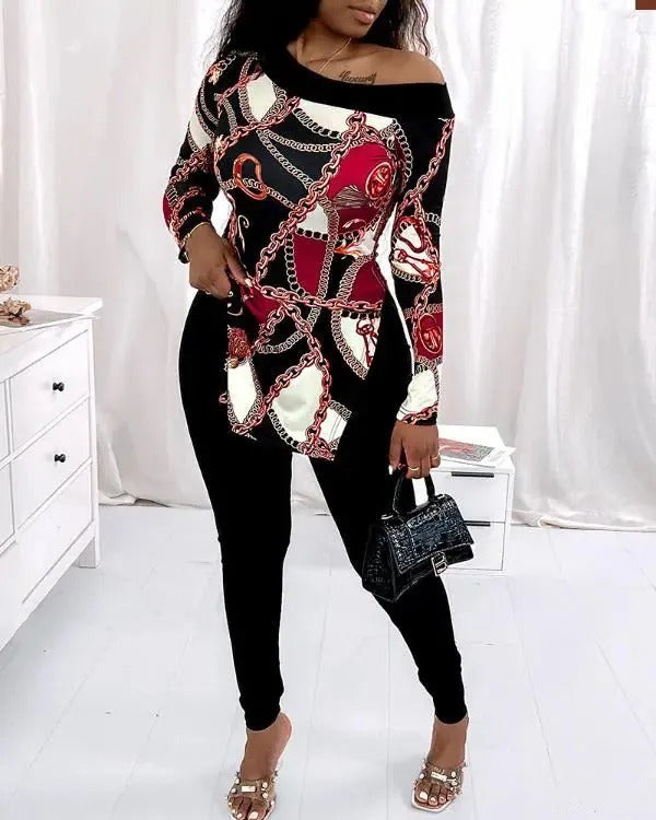 Kadın Uzun Kollu Zincir Desen Tek Omuz Düşük Mikro Bluz