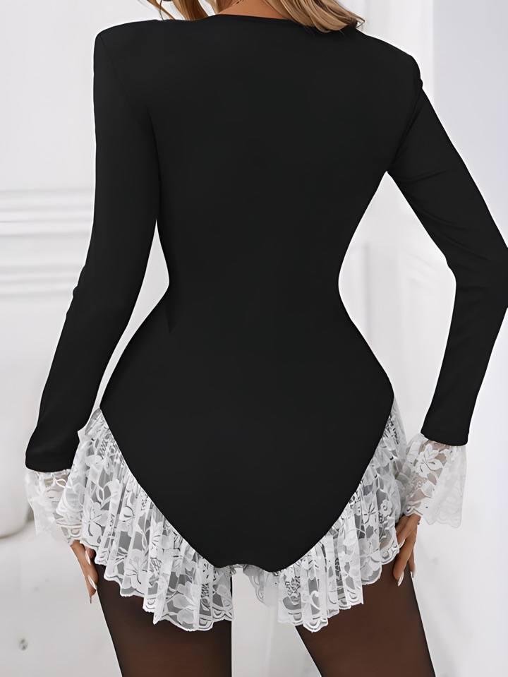 Kadın V Yaka Uzun Kollu Gizli Fermuar Dekolte Ve Dantel Volan Detay Mini şort Tulum