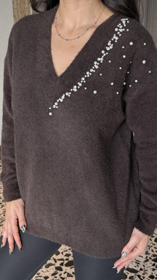 Kadın V Yaka Uzun Kollu Inci Detay Triko Bluz