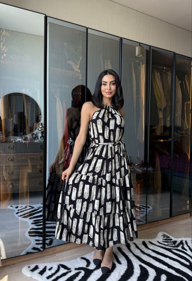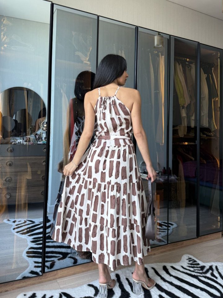 Kadın Viskon Kumaş Ip Askılı Halter Yaka Cepli Midi Boy Elbise
