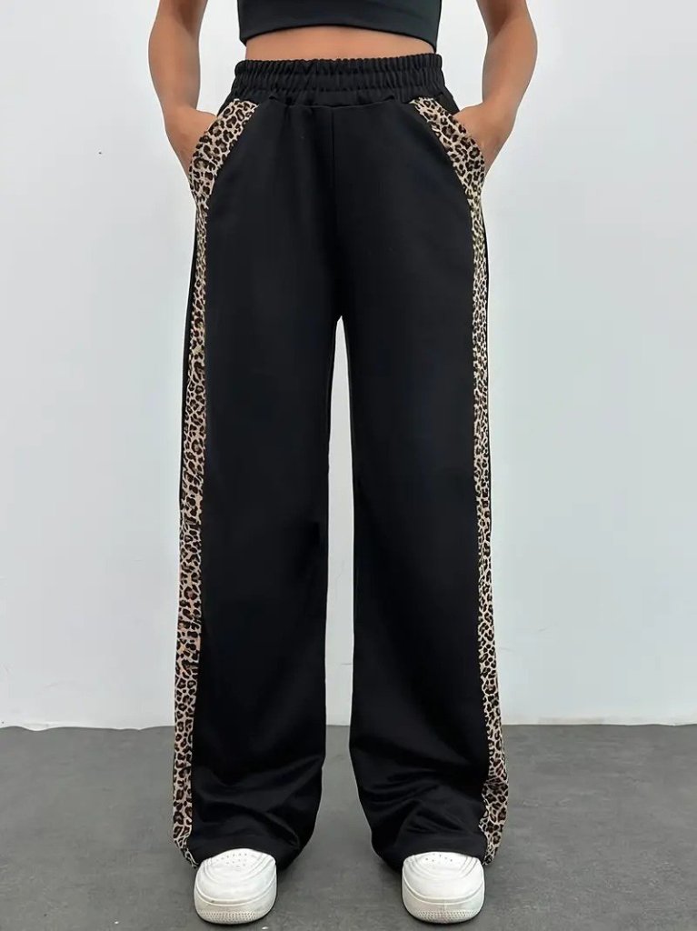 Kadın Yüksek Bel Bağcıklı Yanları Leopar Desenli Viskon Iki Iplik Pantolon