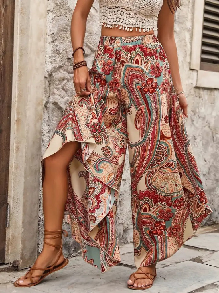Kadın Yüksek Bel Beli Lastikli Desenli Geniş Paçalı Süprem Pantolon