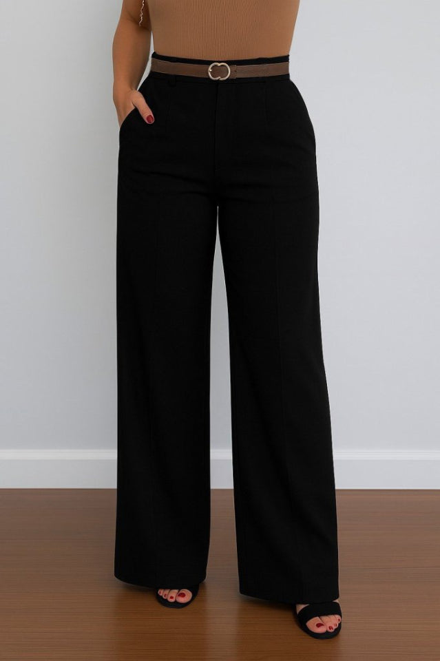 Kadın Yüksek Bel Geniş Paça Detaylı Cepli Ithal Krep Pantolon