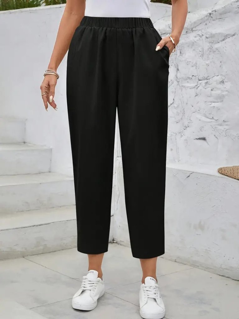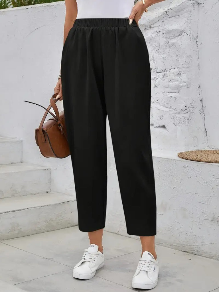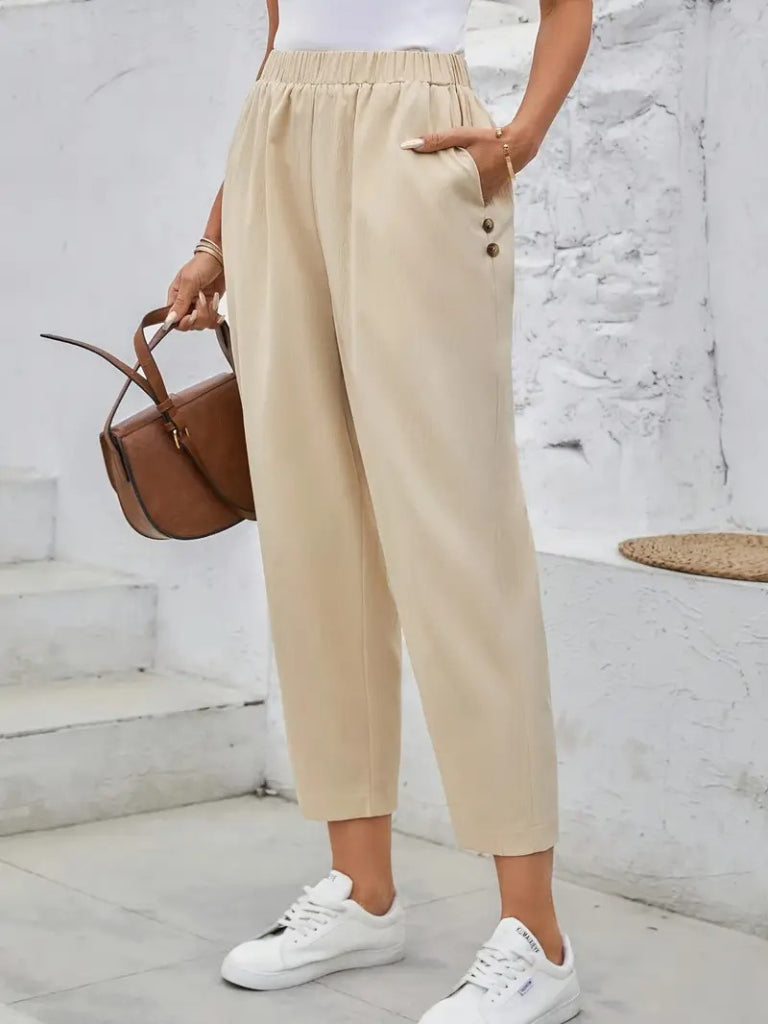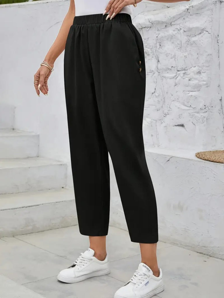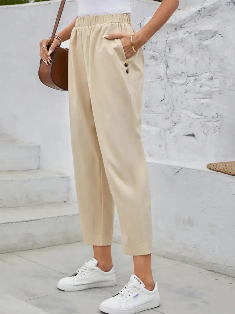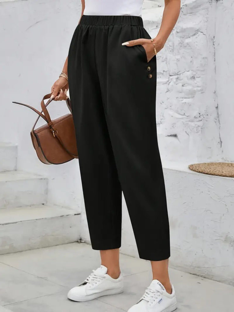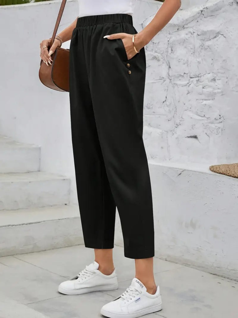 Kadın Yüksek Bel Yandan Cepli Düğme Detaylı Geniş Kesim Ithal Krep Pantolon