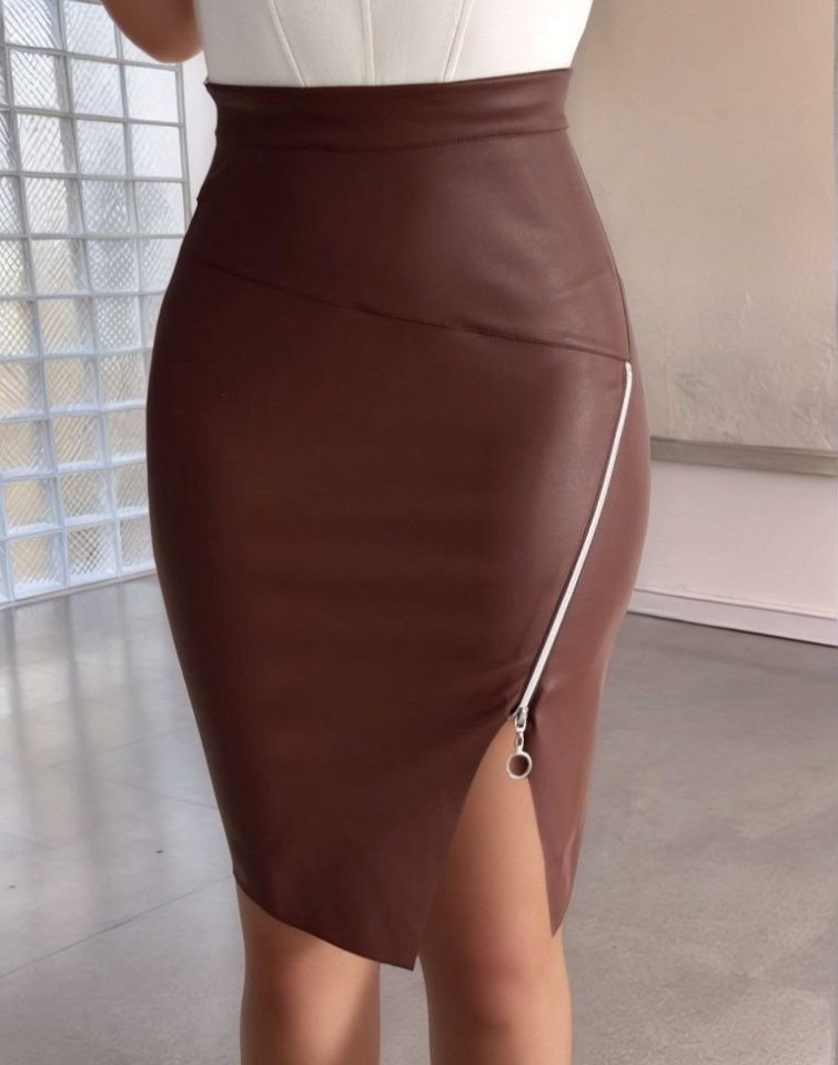 Kadın Yüksek Bel Yandan Fermuarlı Ve Yırtmaçlı Deri Etek
