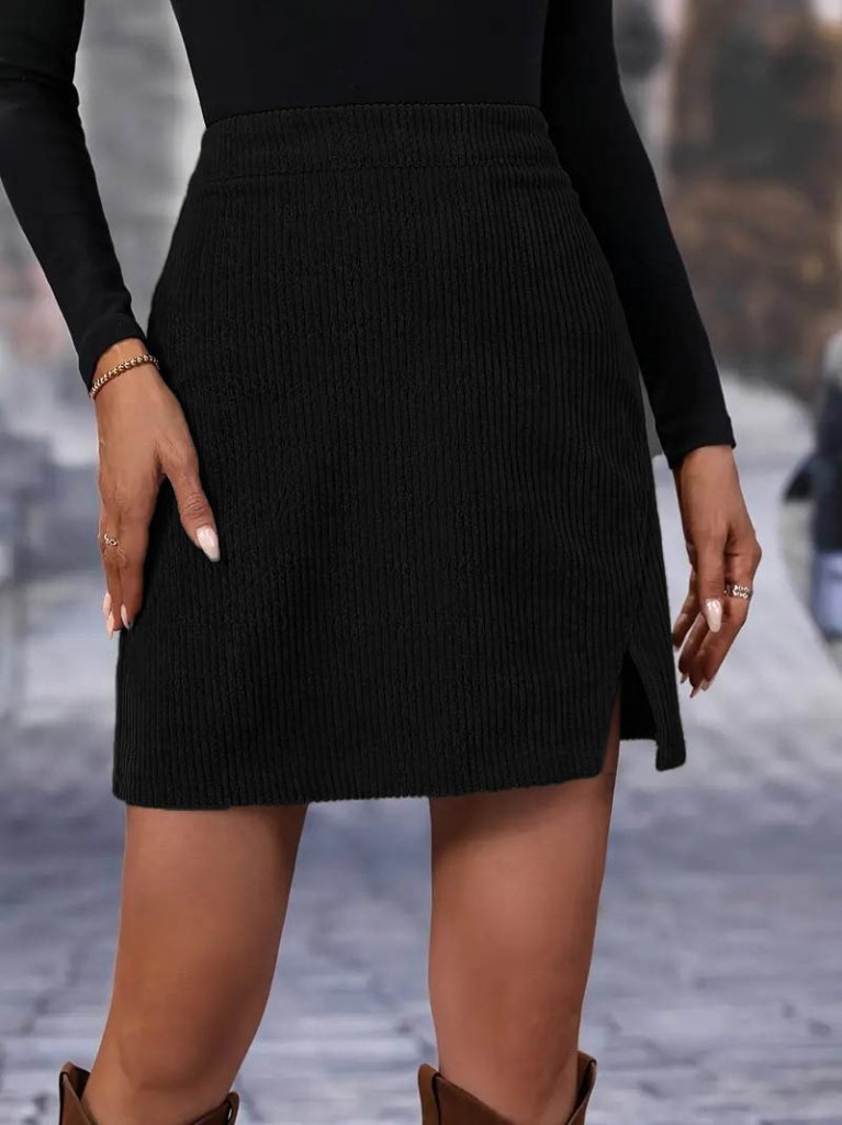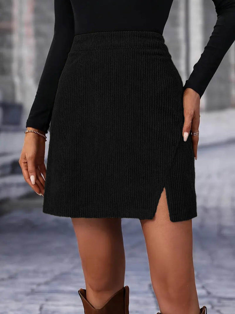 Kadın Yüksek Belli Etek Ucu Asimetrik Yırtmaç Detay Kadife Mini Etek