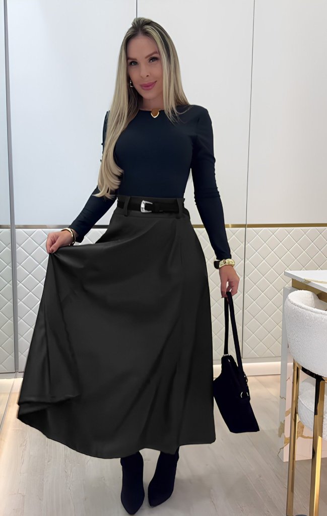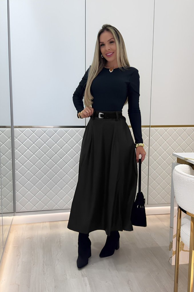 Kadın Yüksek Belli Maxi Deri Kemersiz Etek