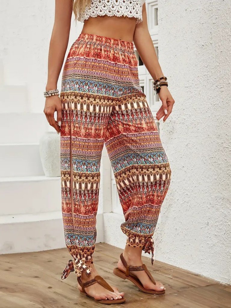 Kadın Yüksek Belli Yanlardan Yırtmaç Detaylı Desenli Bürümcük Pantolon