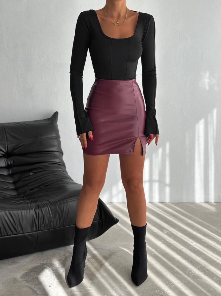 Kadın Yüksel Bel Yırtmaç Detay Mini Deri Etek