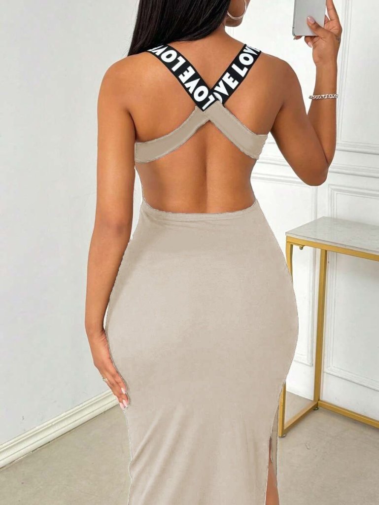 Kadın Yuvarlak Yaka Sırttan çapraz şerit Love Detaylı Yırtmaçlı Viskon Elbise