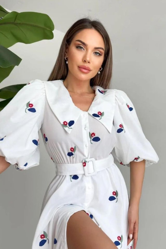Kahverengi Yakası Çiçek Motifli Kemerli Elbise