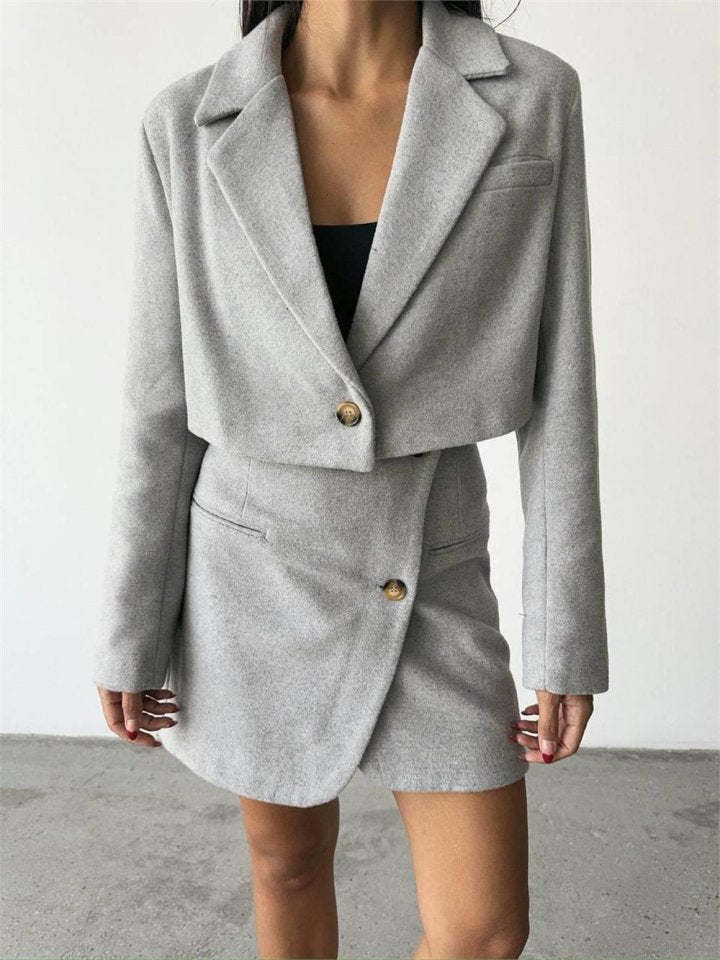 KAŞE CROP CEKET - DÜĞME DETAYLI KISA ETEK TAKIM - Gri