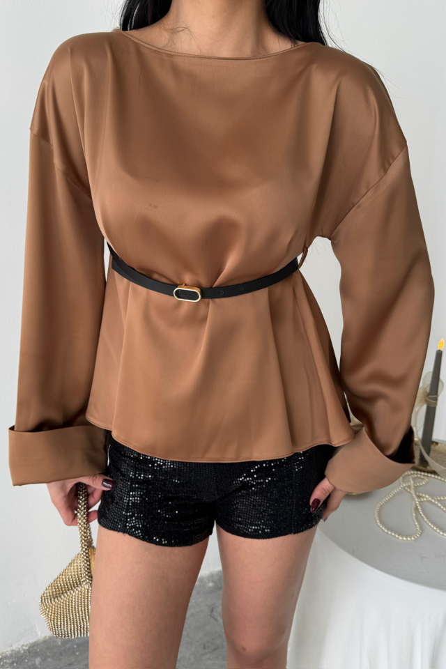 KEMER DETAYLI SATEN BLUZ - Kahverengi