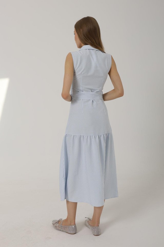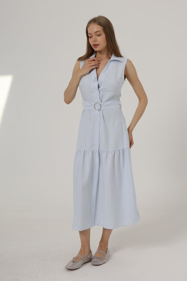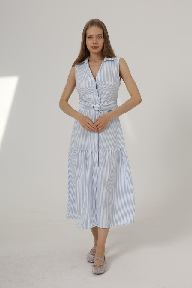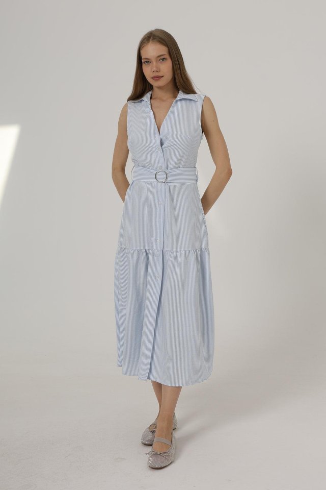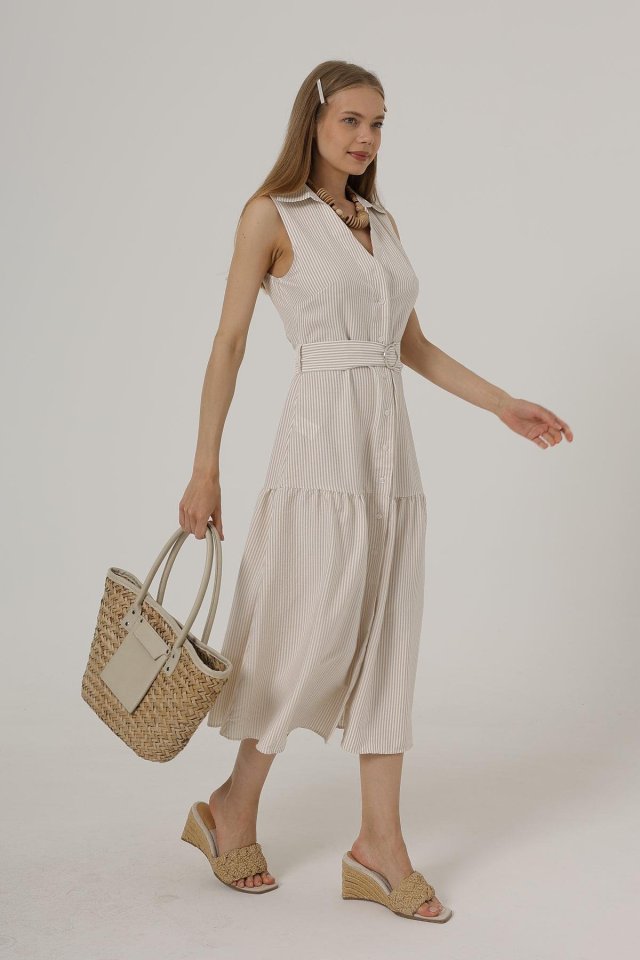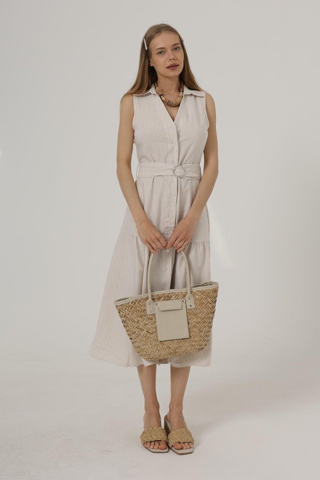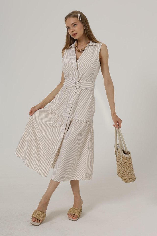 Kemerli Çizgili Elbise - Taş