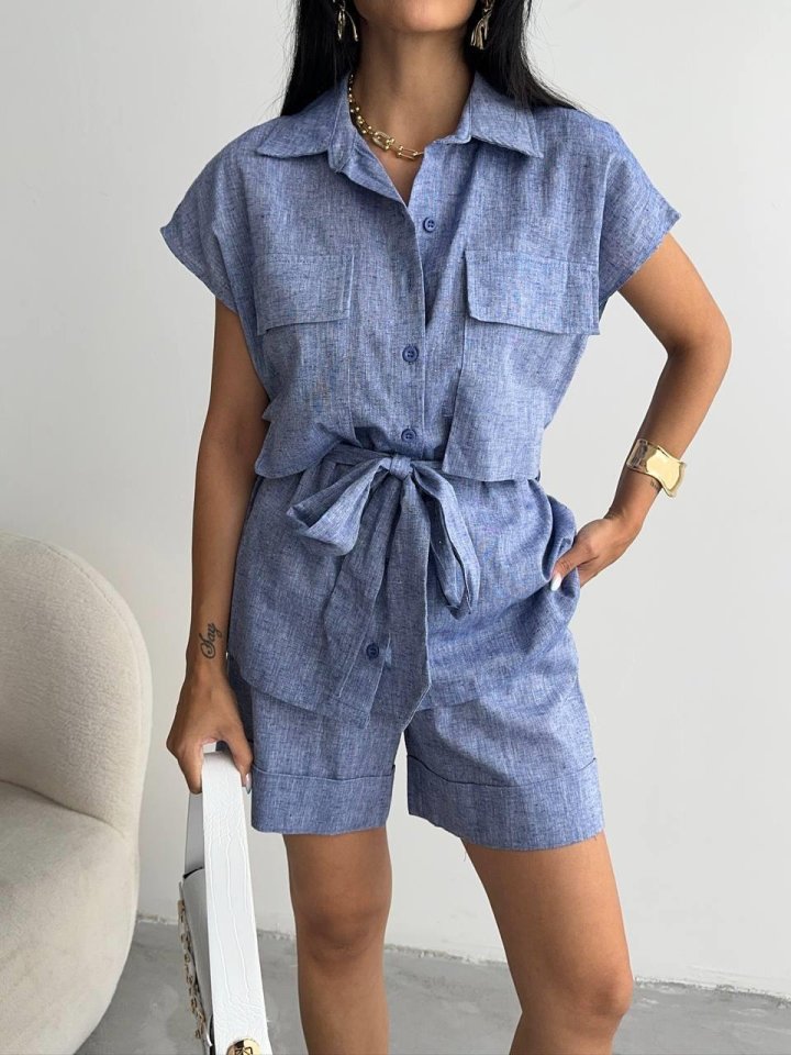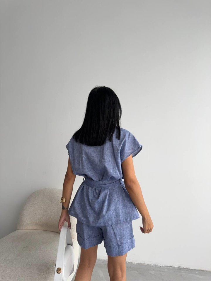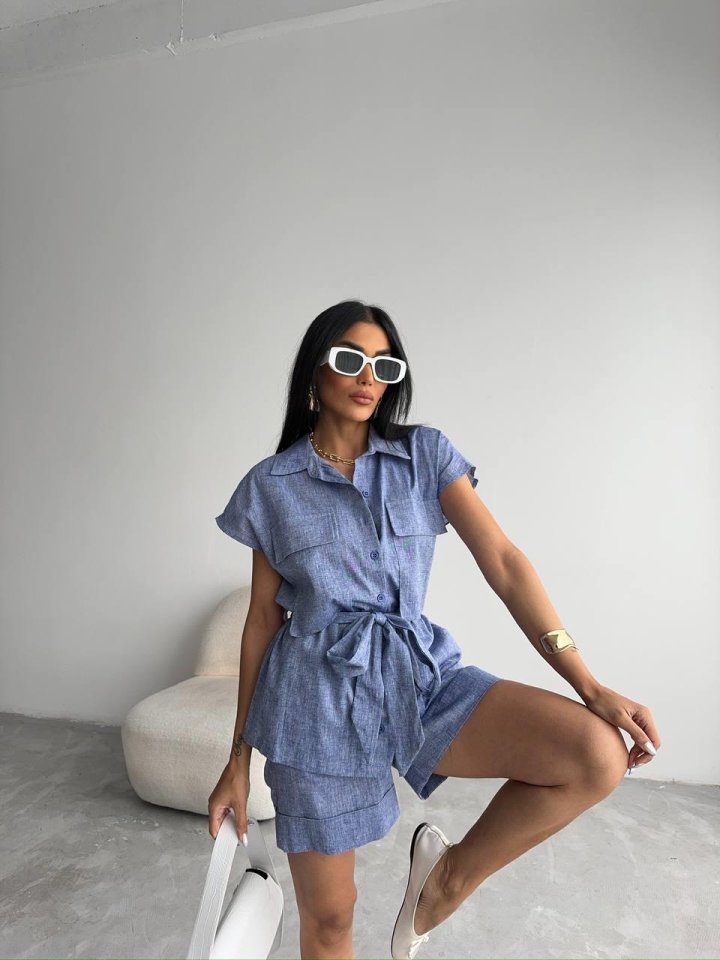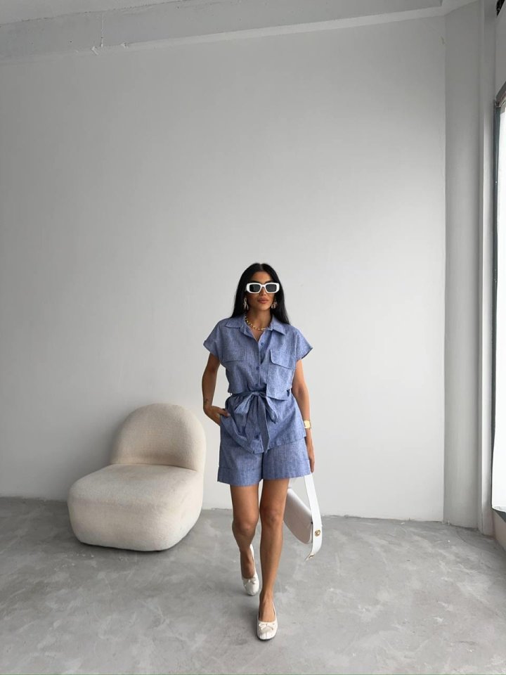 KETEN BAĞLAMALI KOLSUZ GÖMLEK - DUBLE PAÇA ŞORT TAKIM - Lacivert