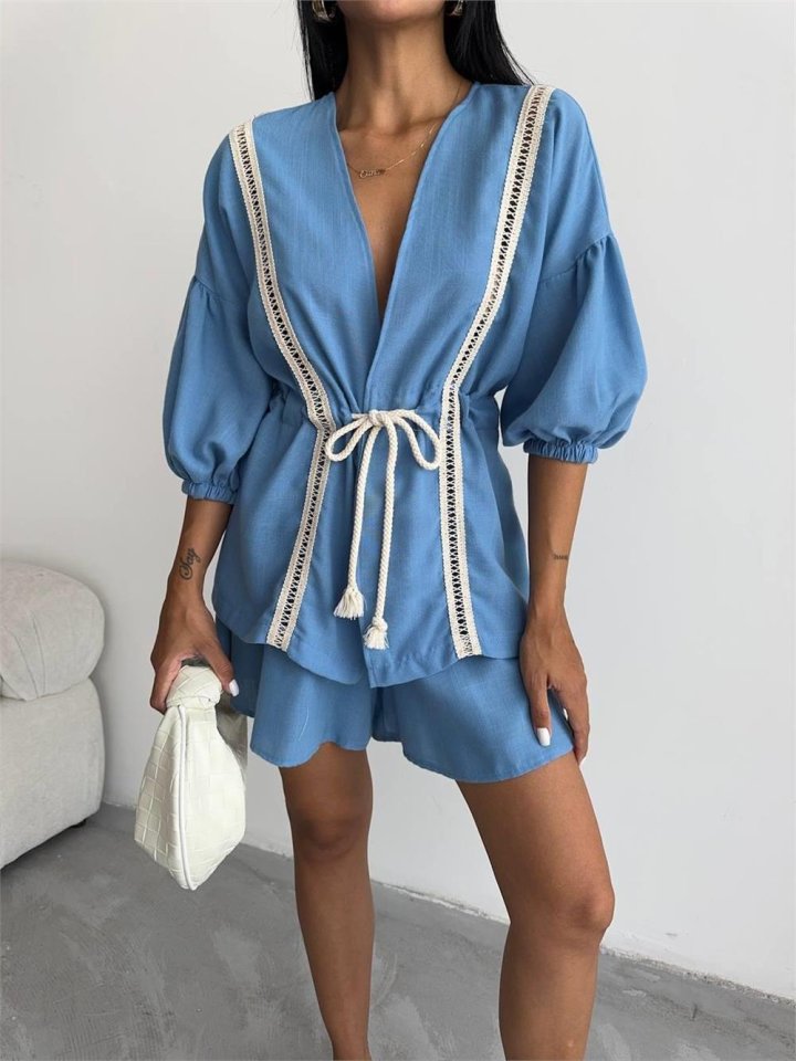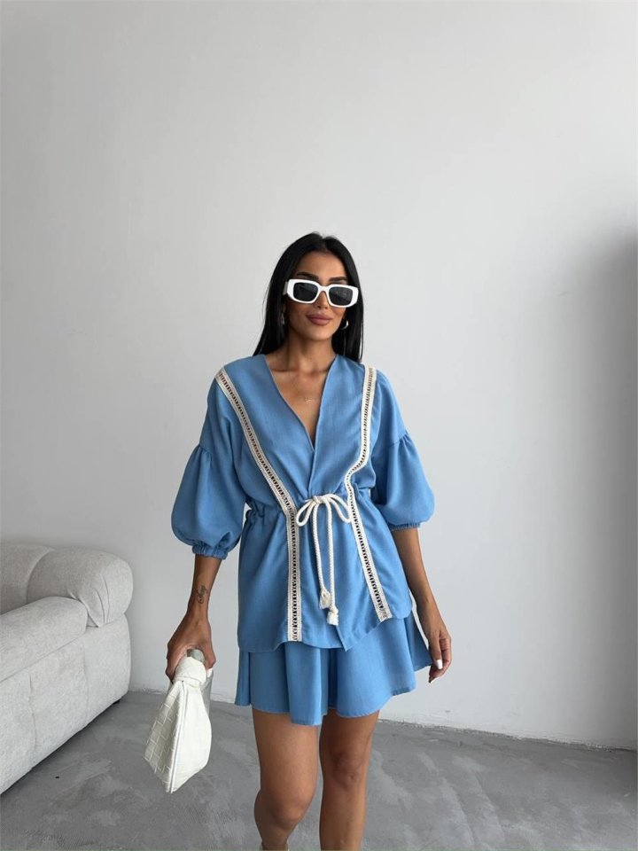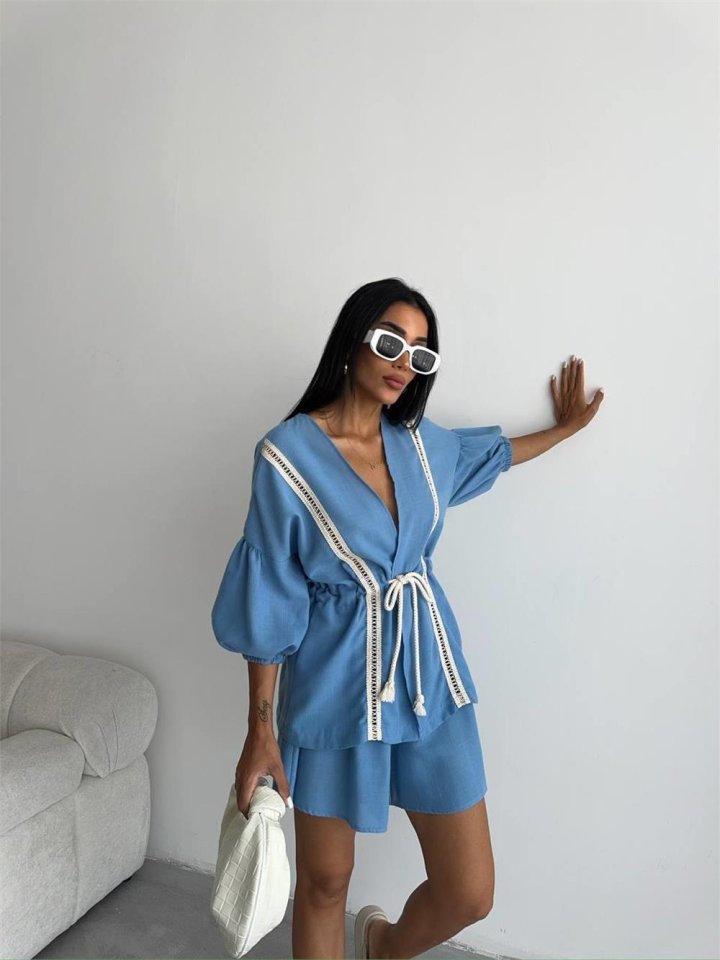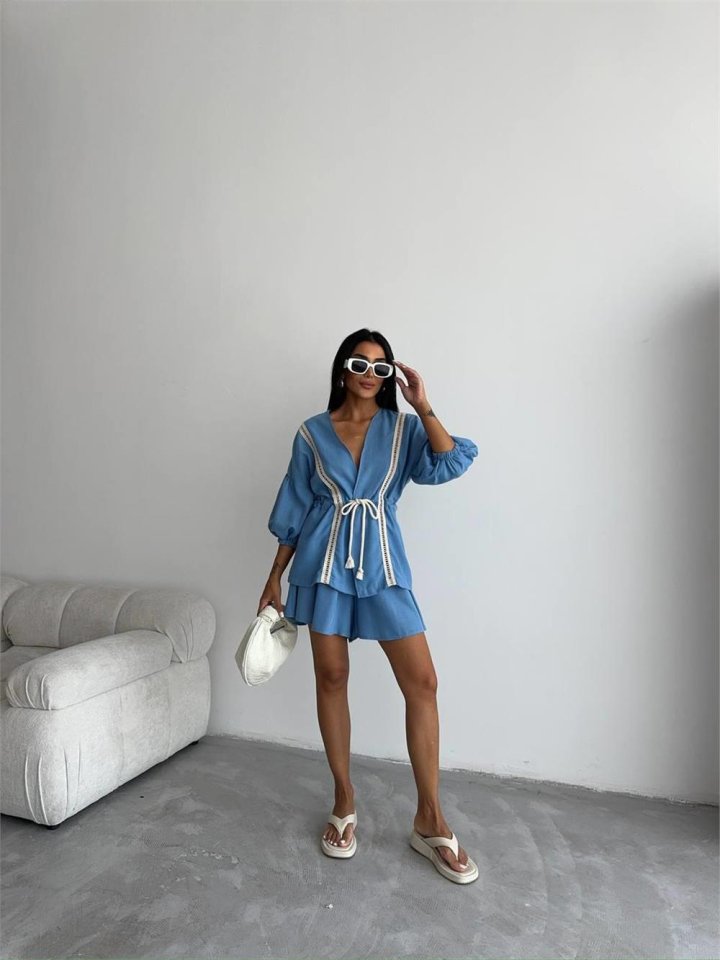 KETEN BEL BÜZGÜLÜ BLUZ-PANTOLON TAKIM - Mavi