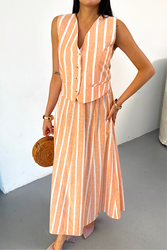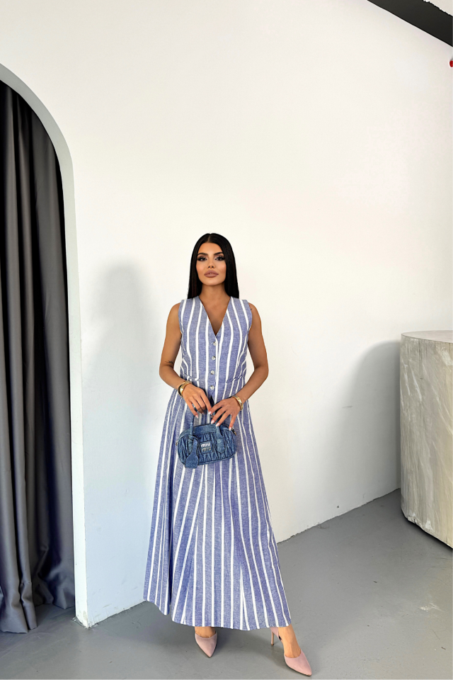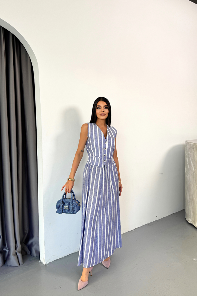 KETEN ÇİZGİLİ YELEK - UZUN ETEK TAKIM - Mavi