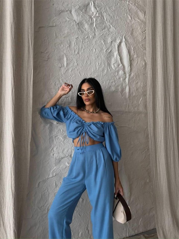 KETEN CROP BLUZ BÜZGÜ YAKA + PANTOLON TAKIM - Mavi