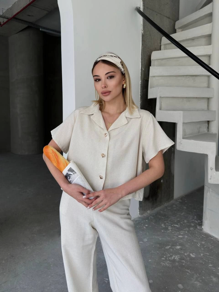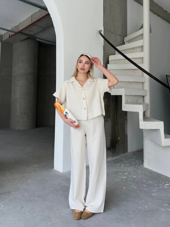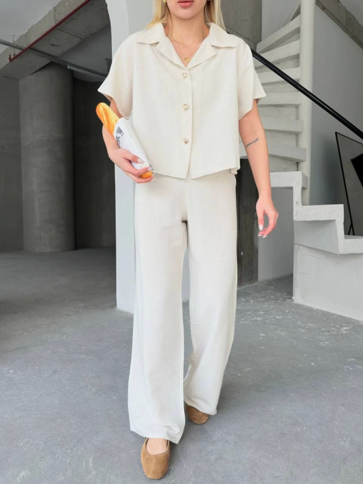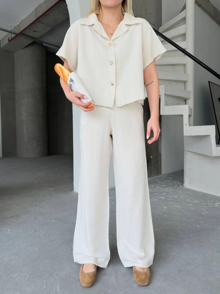 Keten Kısa Kollu Gömlek Pantolon Ikili Takım - Beyaz
