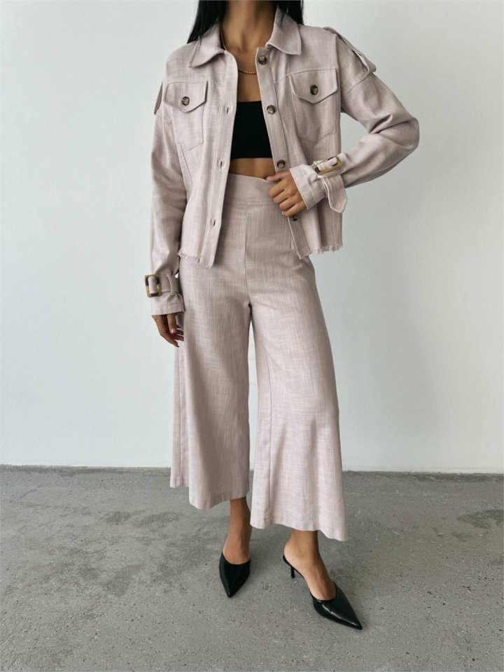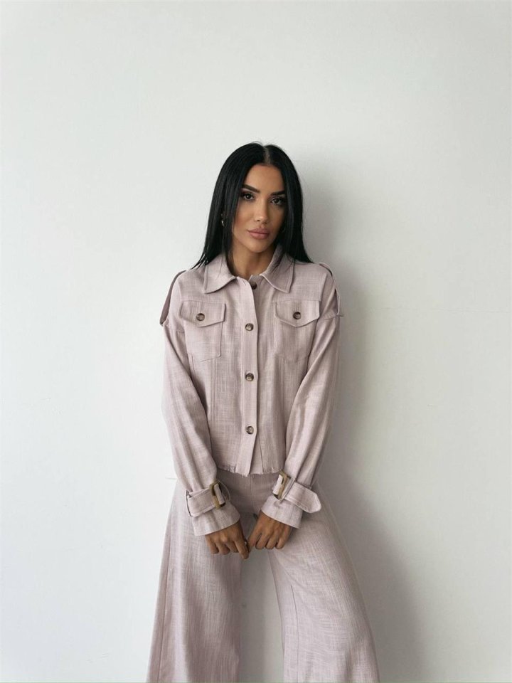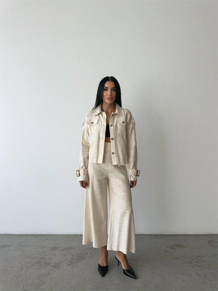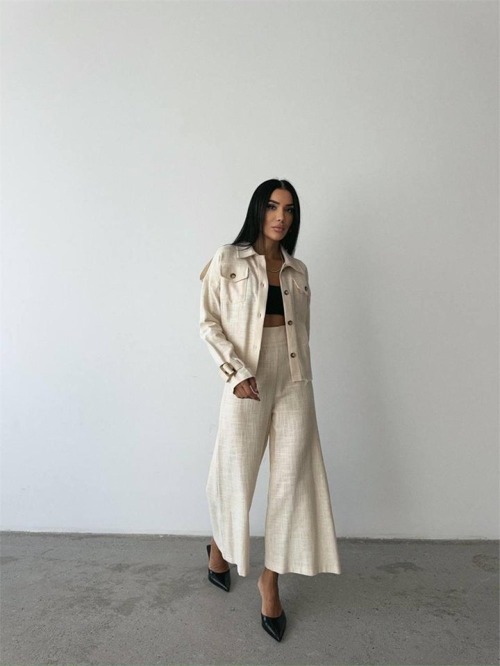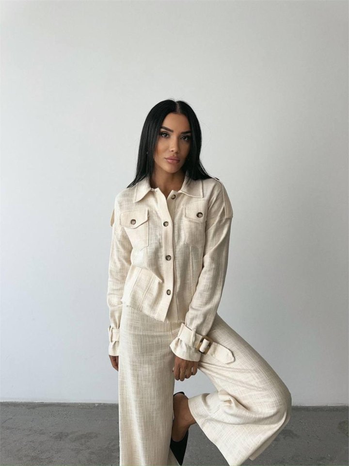 KETEN PÜSKÜL DETAYLI GÖMLEK-PANTOLON TAKIM - Ham