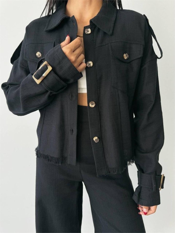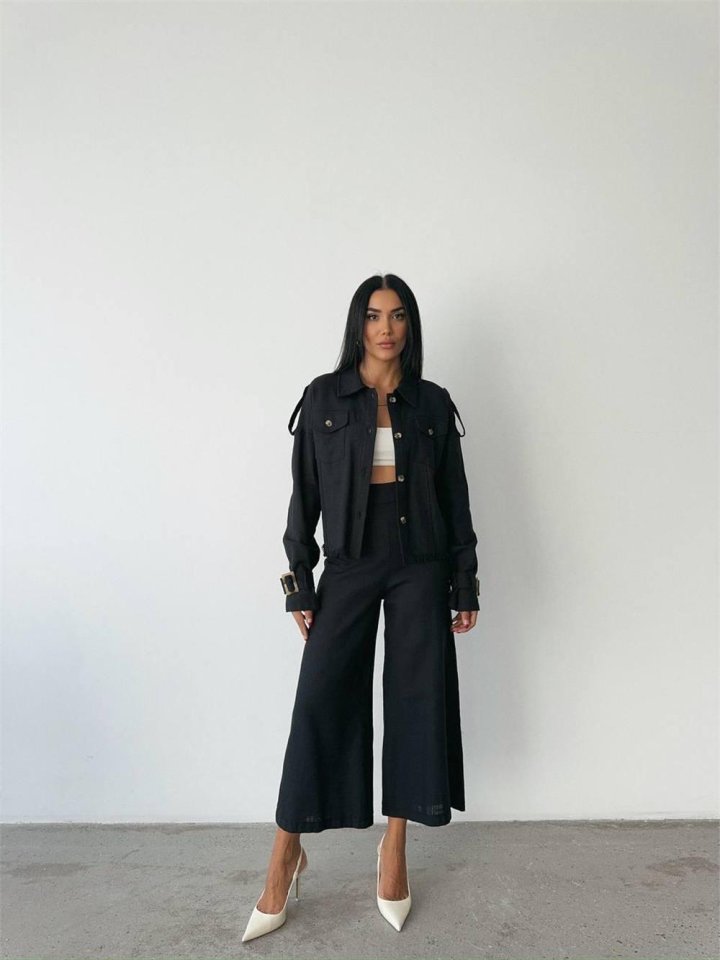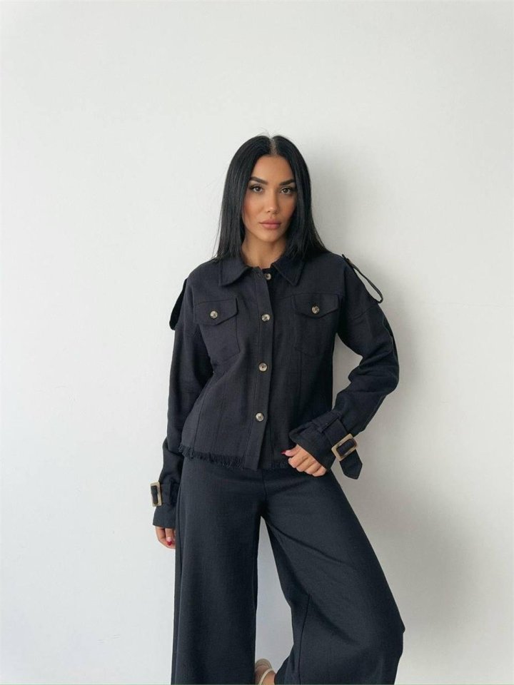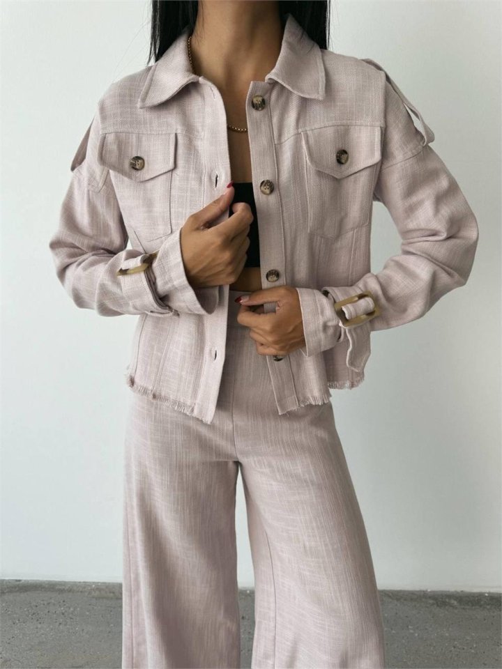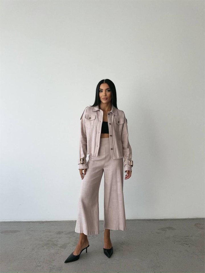 KETEN PÜSKÜL DETAYLI GÖMLEK-PANTOLON TAKIM - Ham