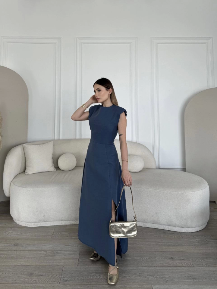 Keten Yandan Yırtmaçlı Uzun Sıfır Kolsuz Elbise - Mavi