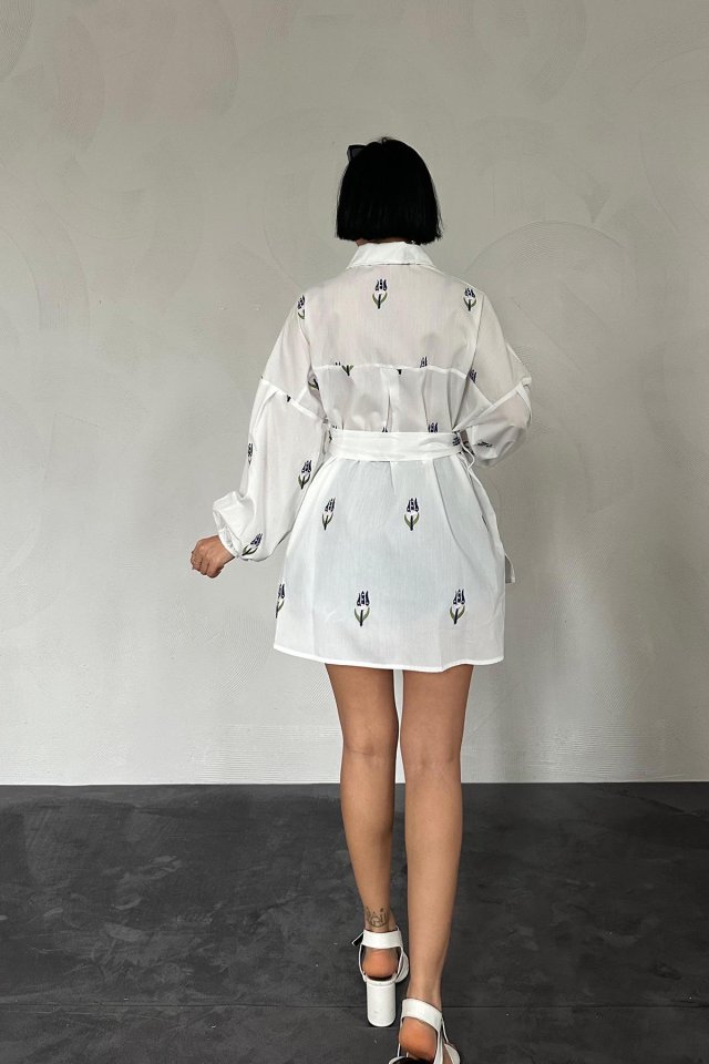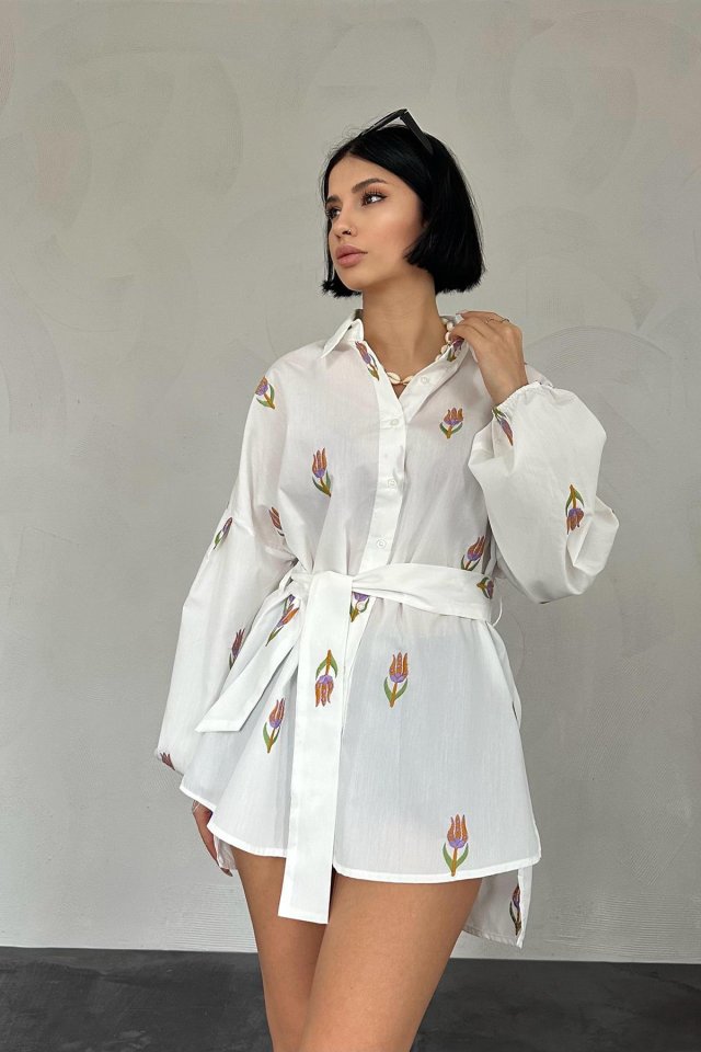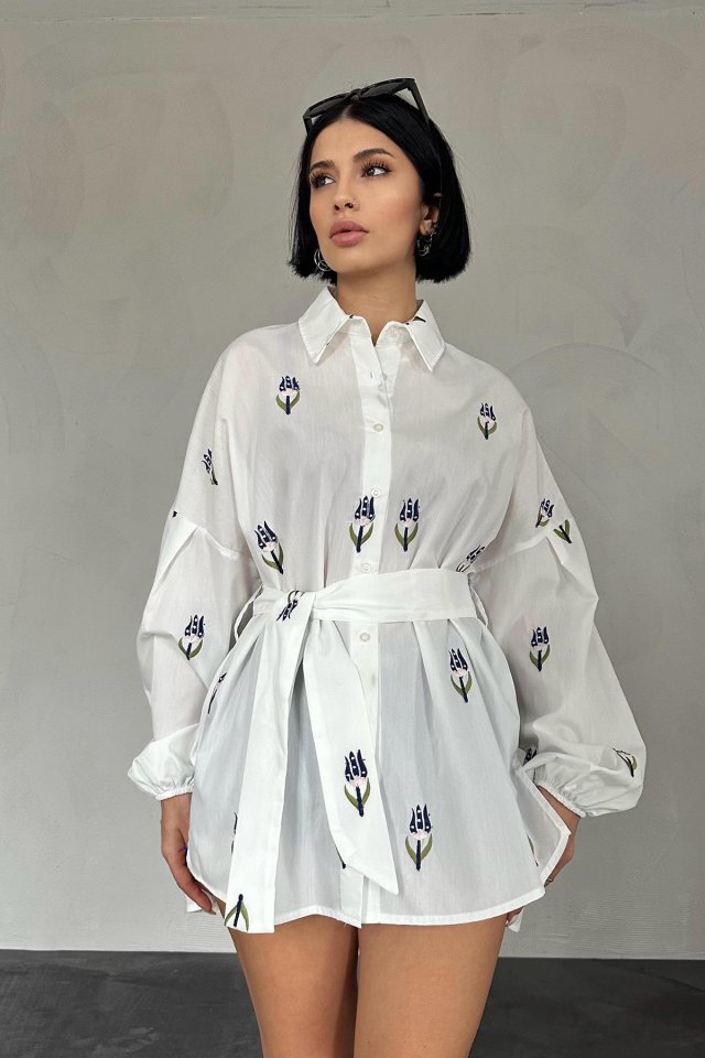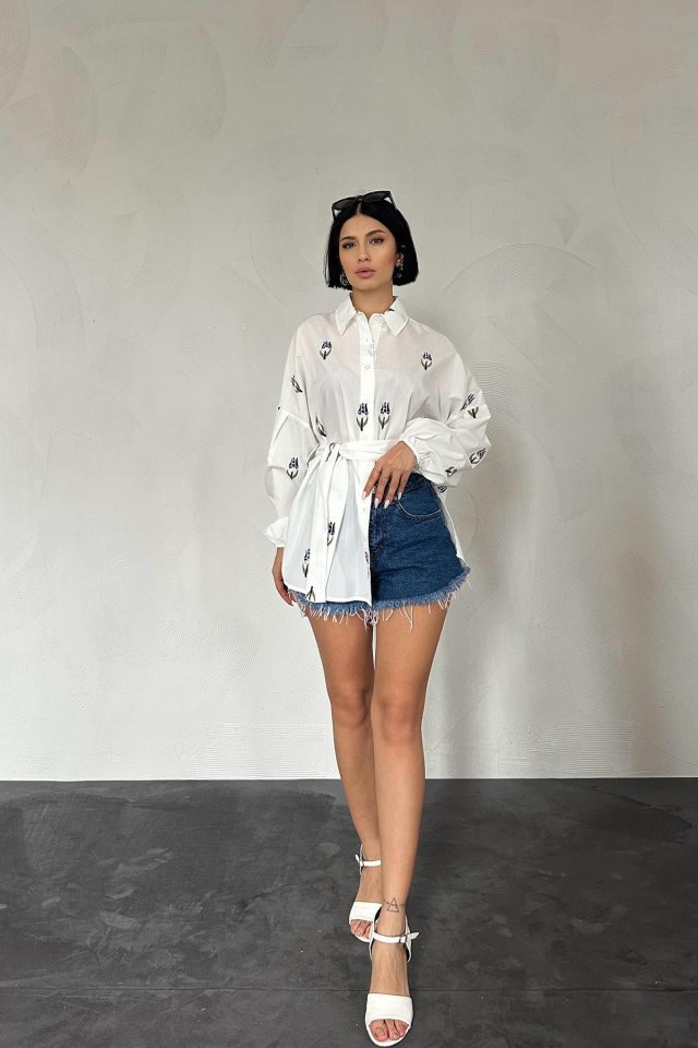 Kırmızı Vual Metraj Nakış Kuşaklı Gömlek