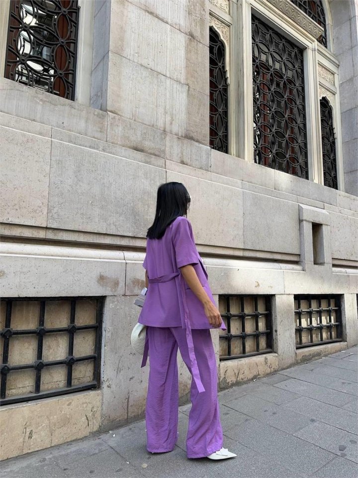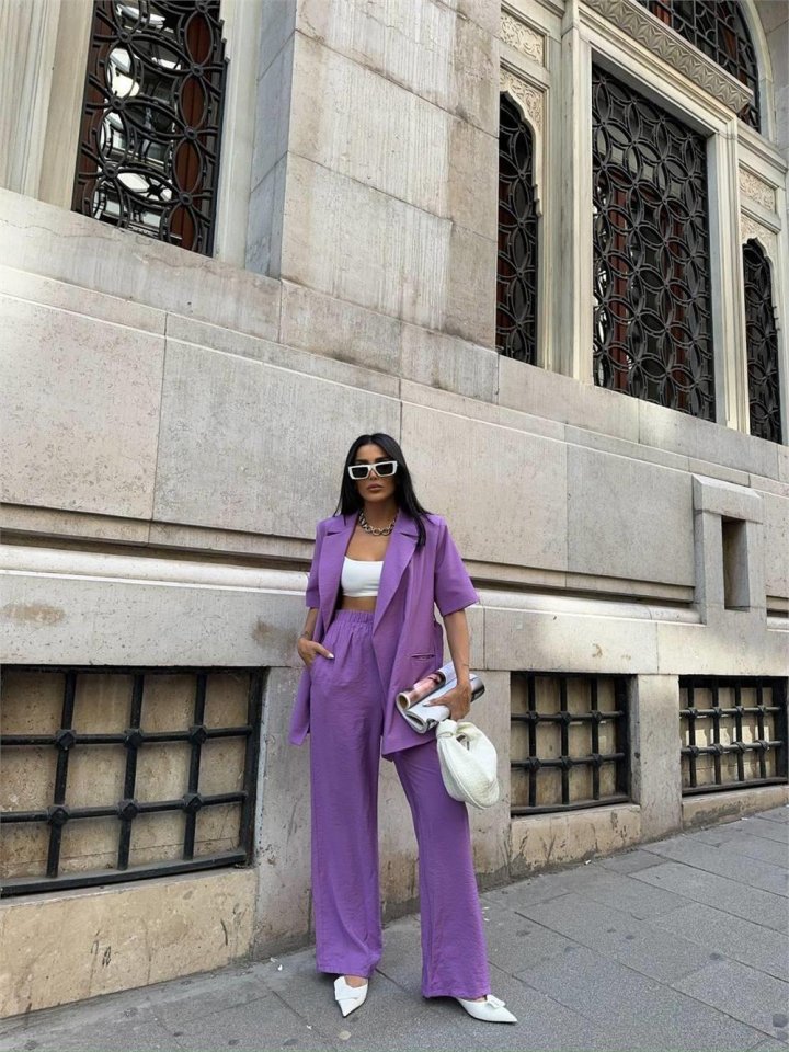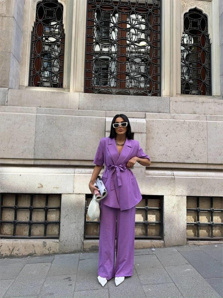 KISA KOL BAĞLAMA DETAYLI CEKET-PANTOLON TAKIM - Mavi