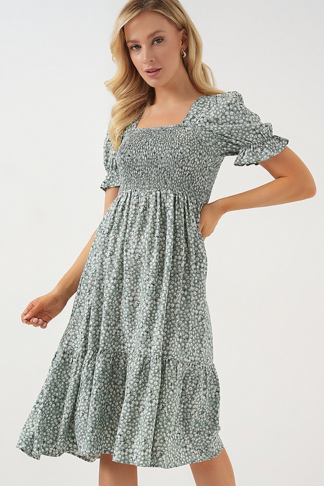 Kısa Kol Çiçekli Elbise 2556 - Mint