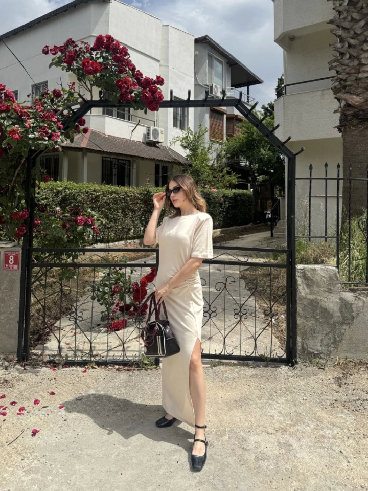 Kısa Kollu Uzun Yandan Yırtmaçlı Elbise - Beyaz