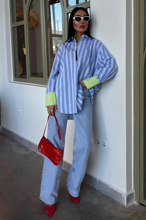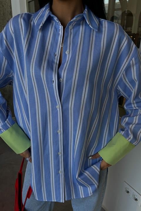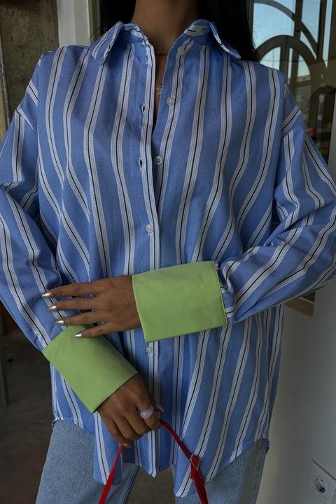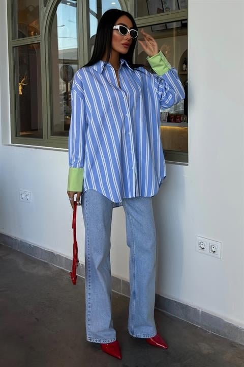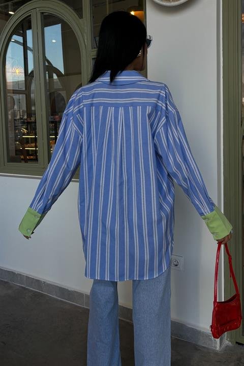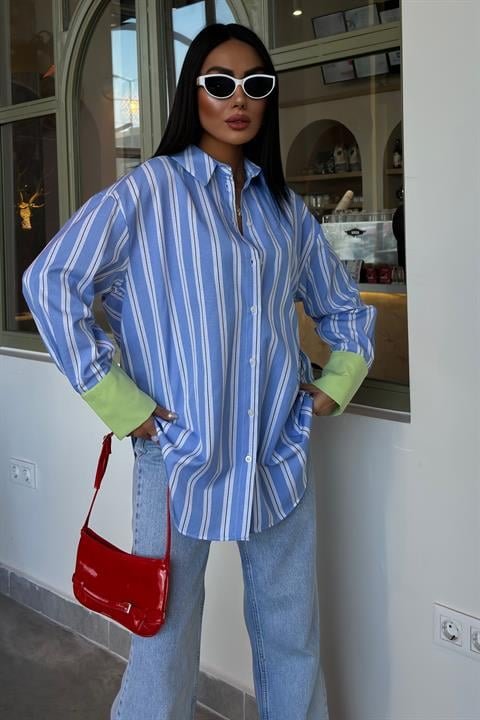 Kolu Manşet Detay Çizgili Oversize Gömlek 3405