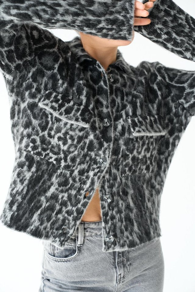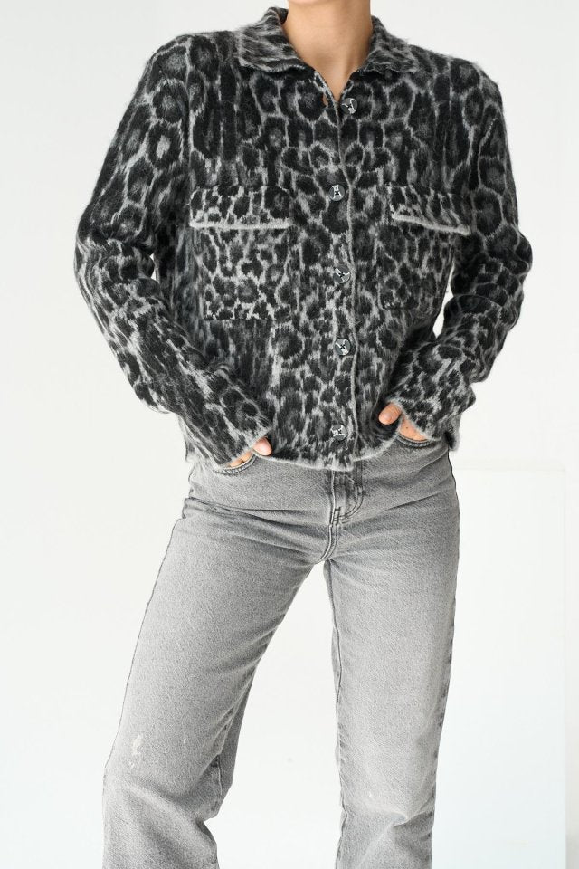 Leopar Desen Jakarlı Hırka - Siyah-Açık Gri