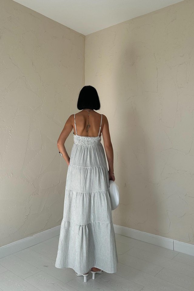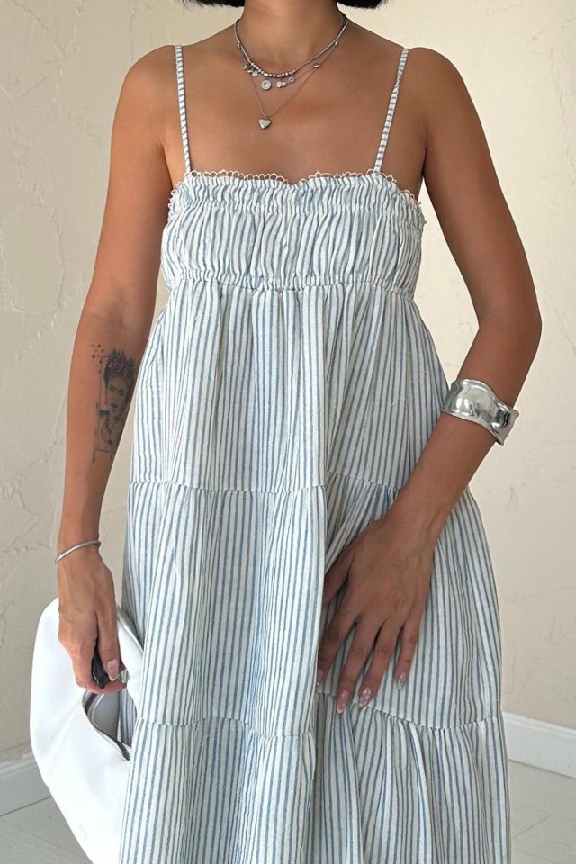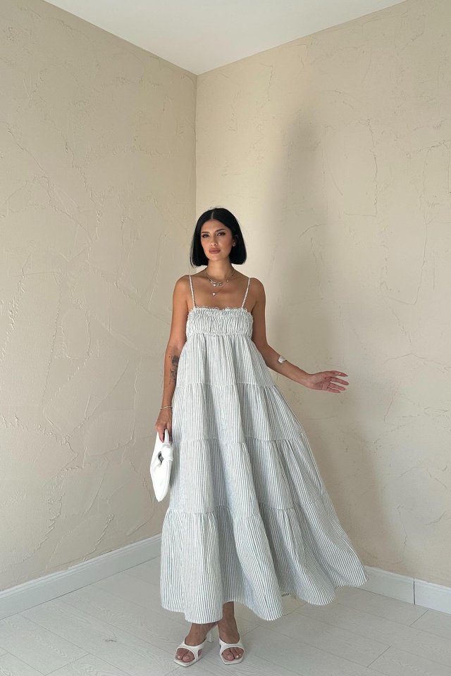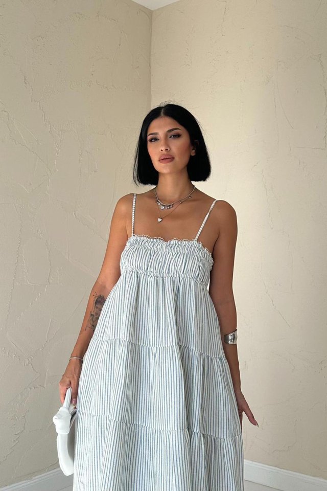 Mavi Askılı Parçalı Çizgili Müslin Elbise