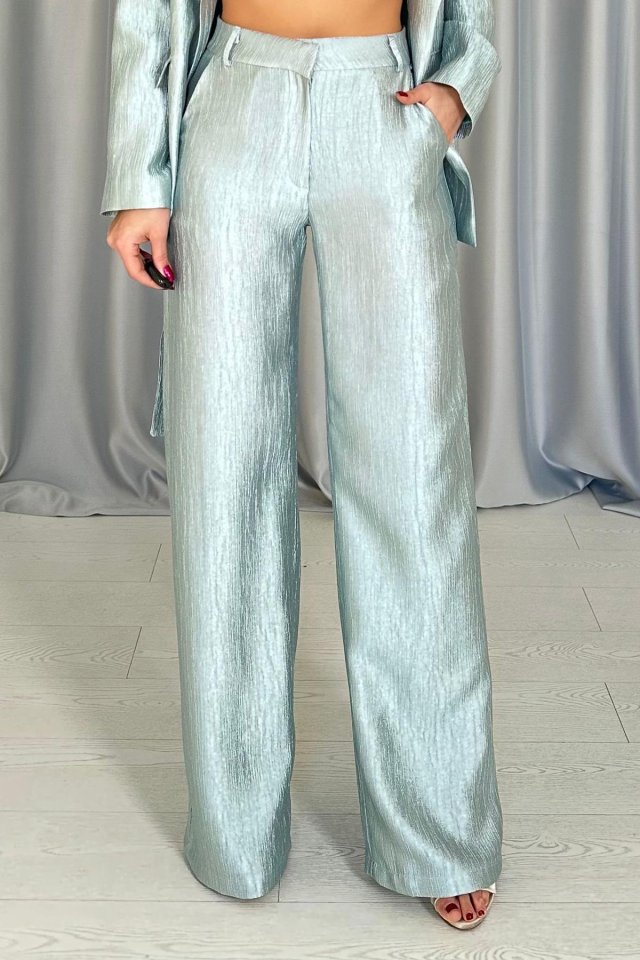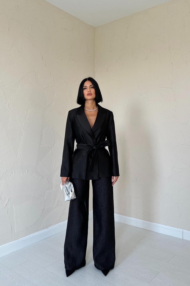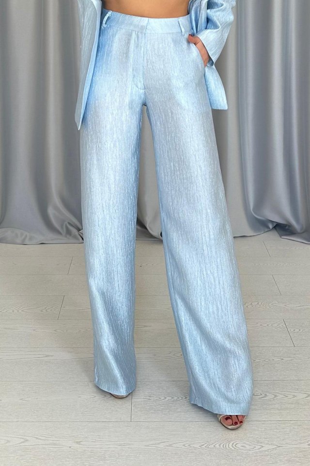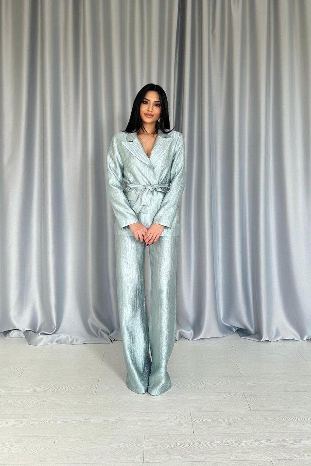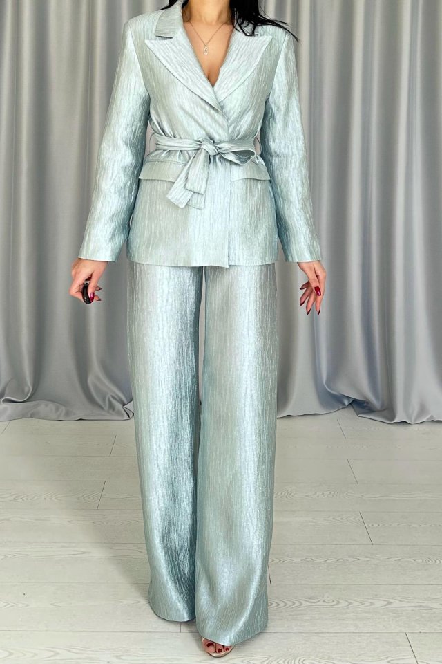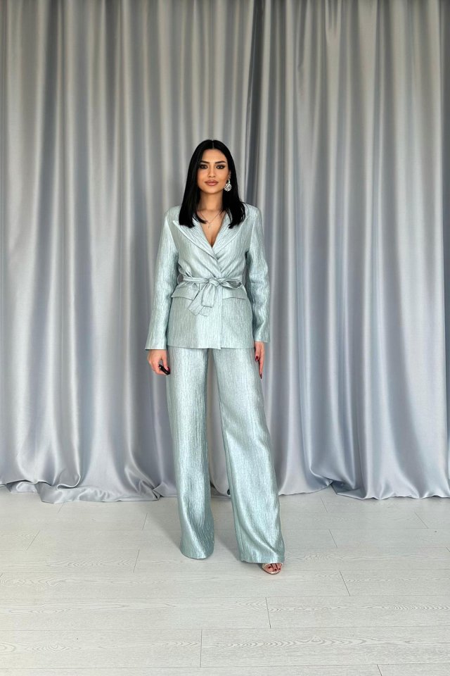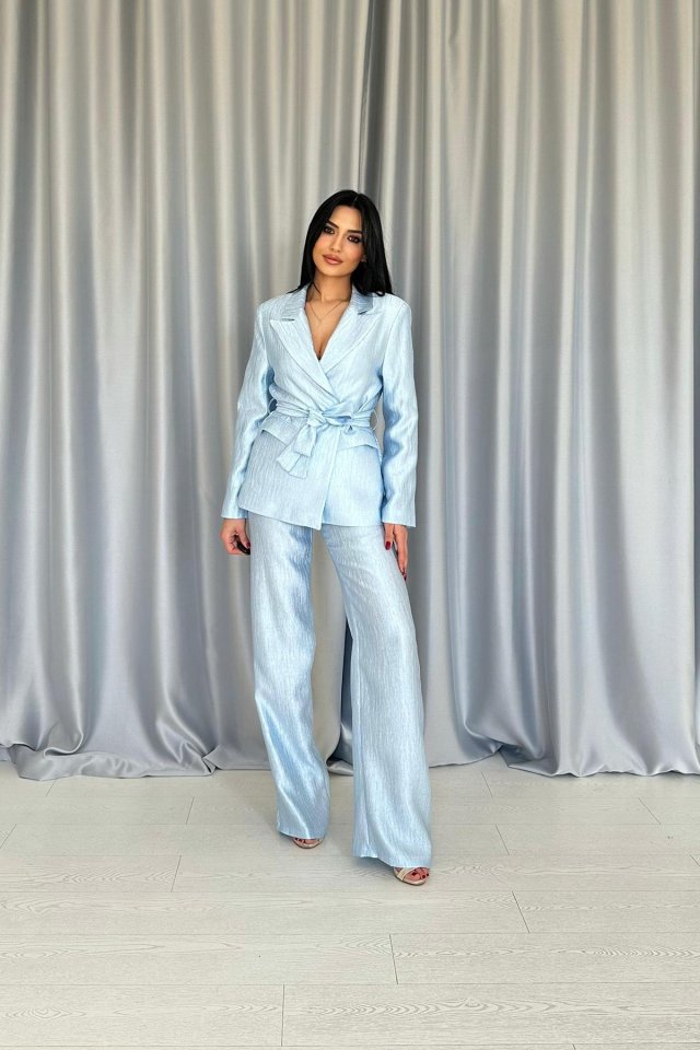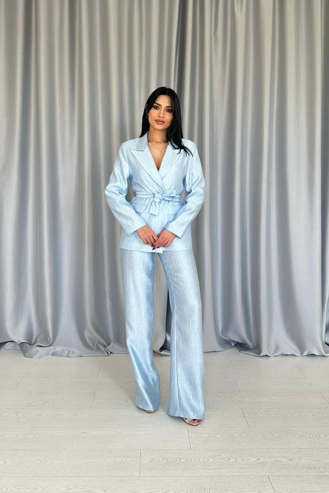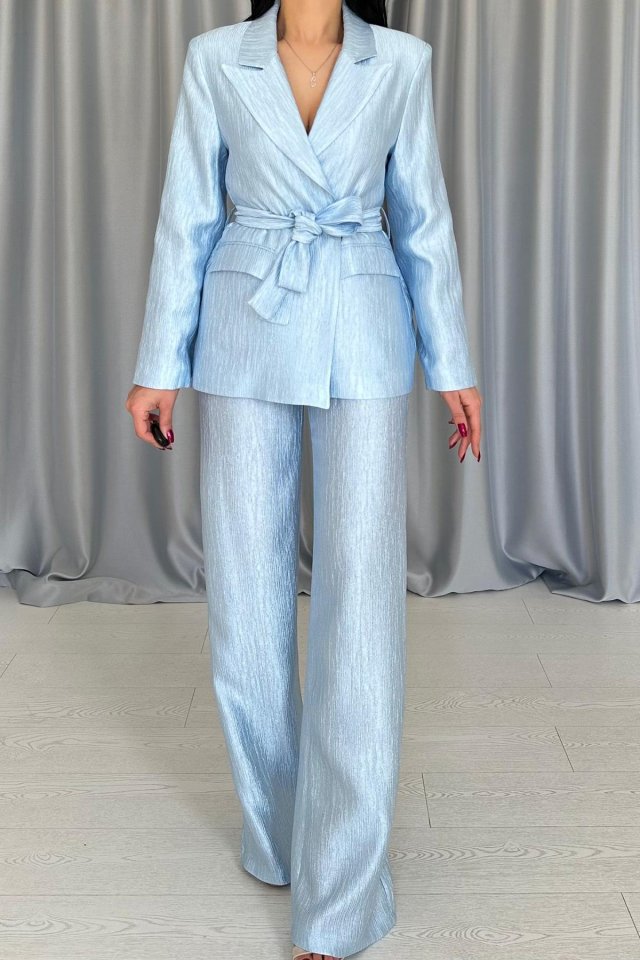 Mavi Beli Kuşaklı Ceket Ve Pantolon Parlak Takım