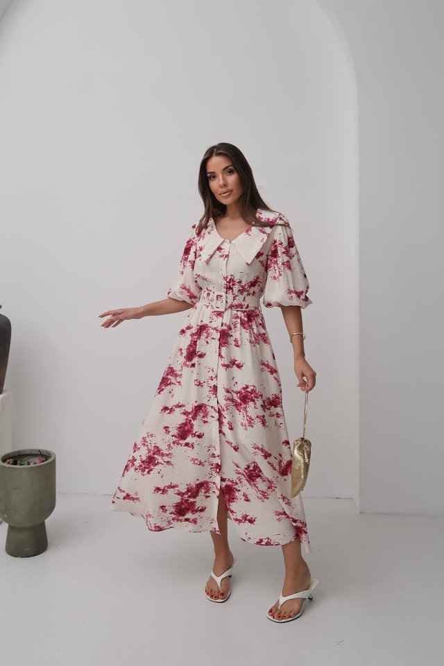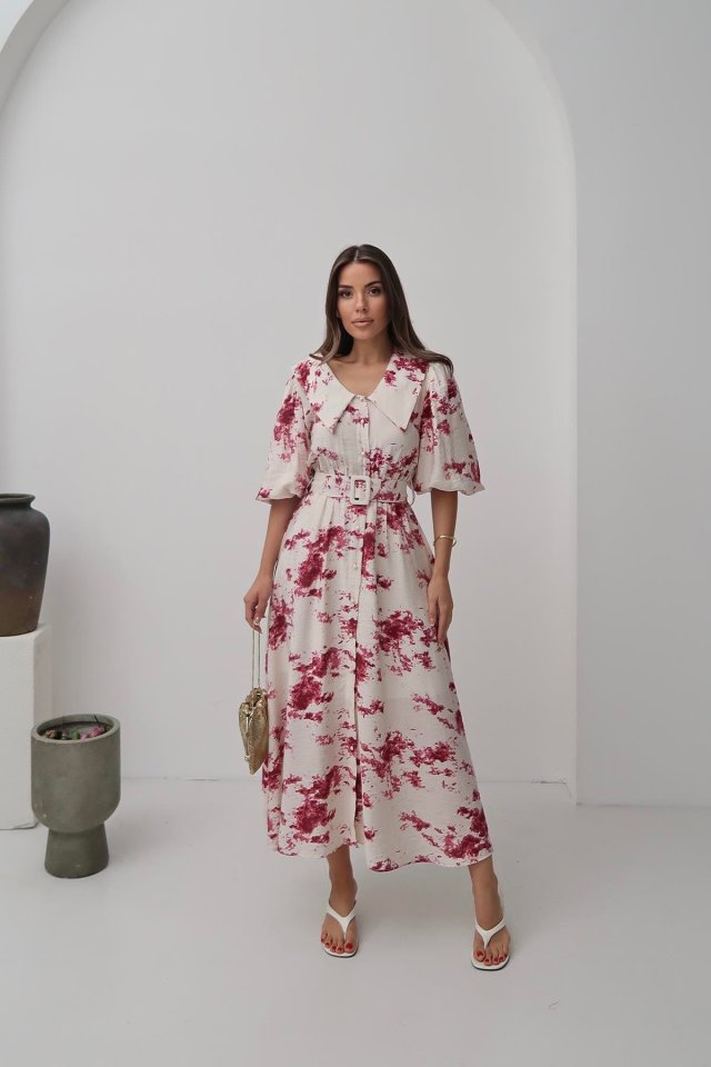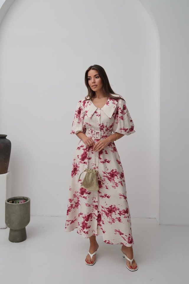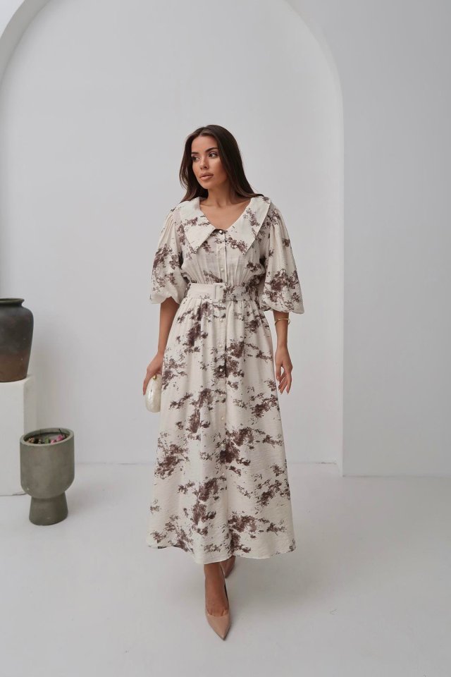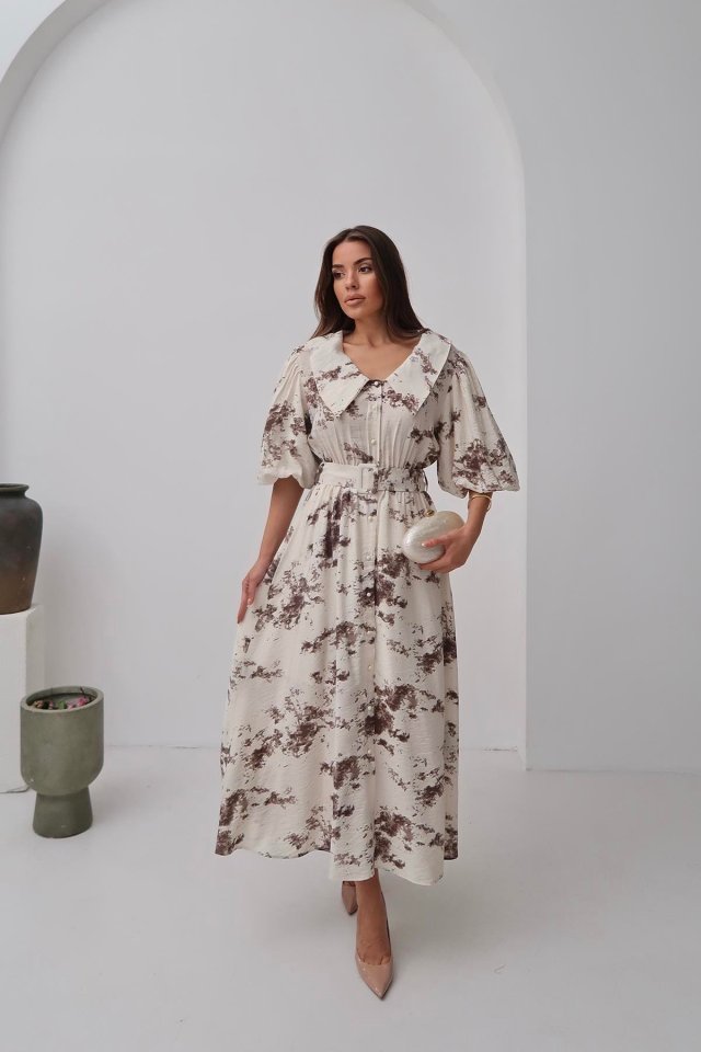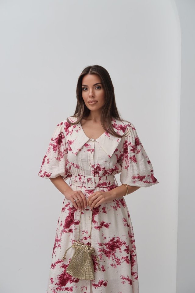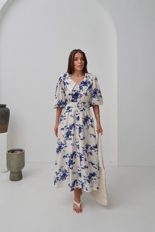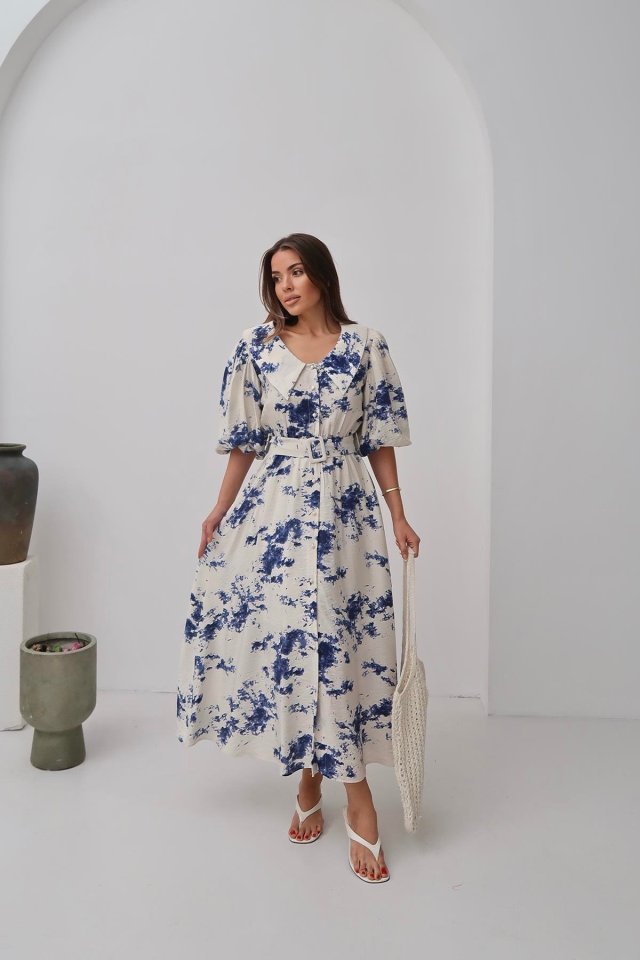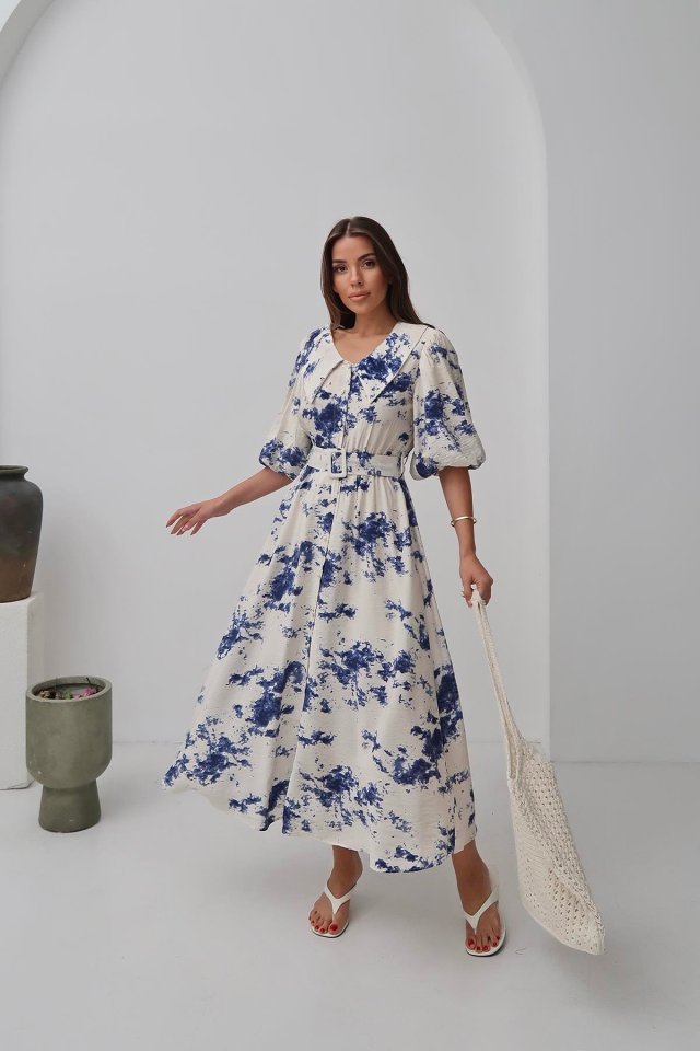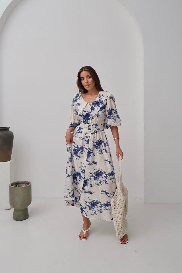 Mavi Desenli Kemerli Elbise