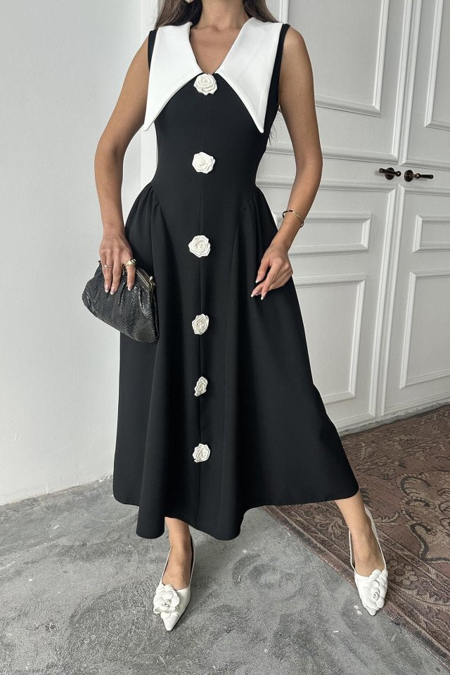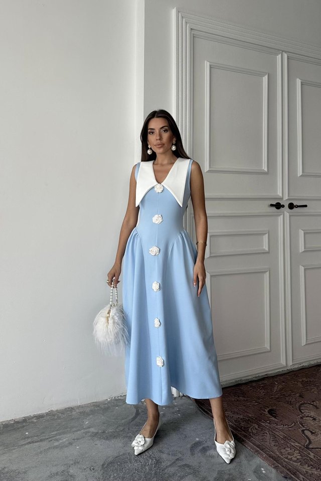 Mavi Gül Detaylı Atlas Elbise