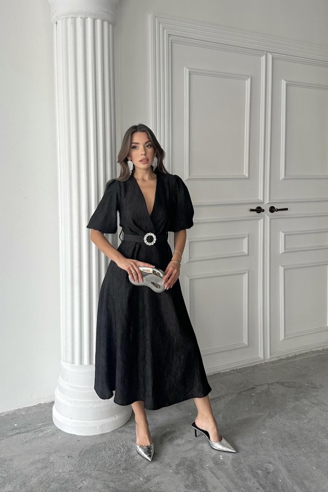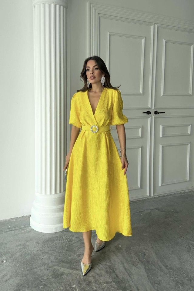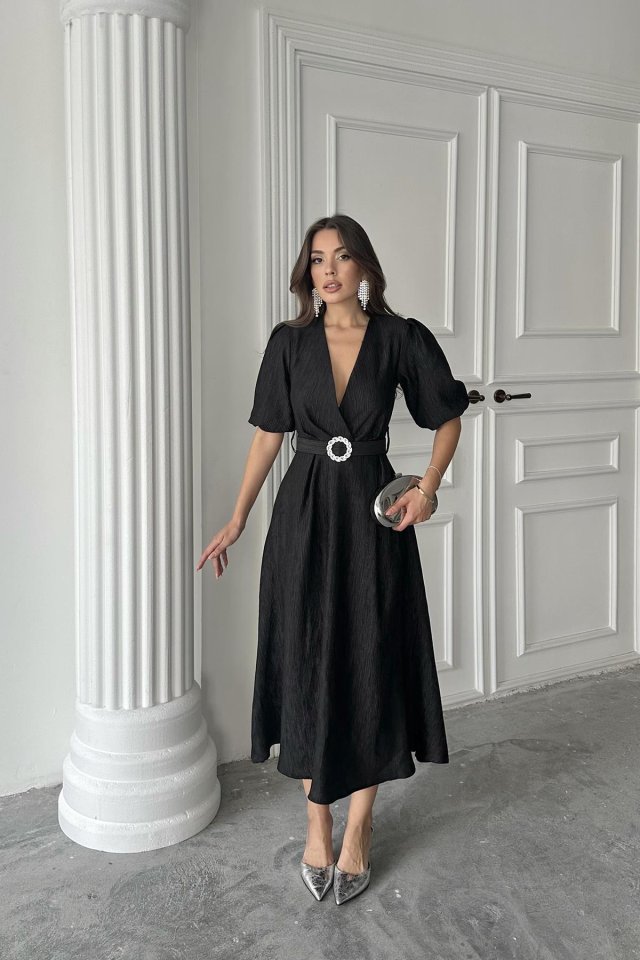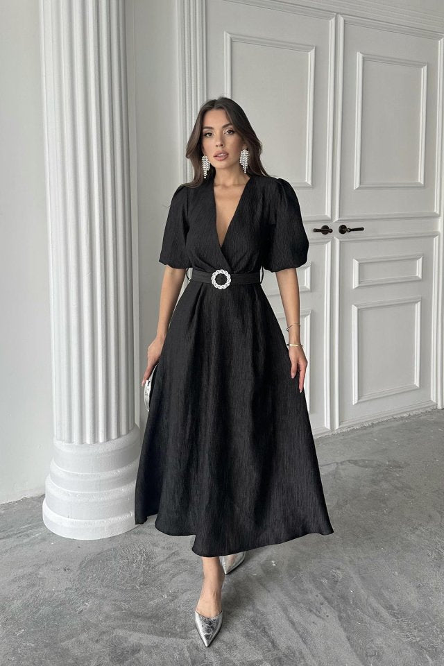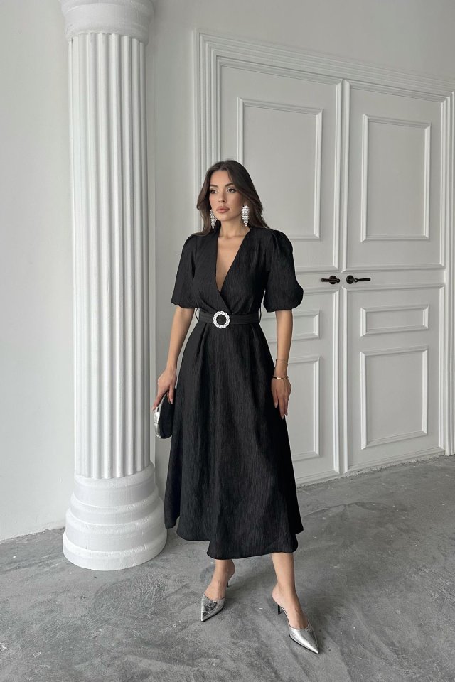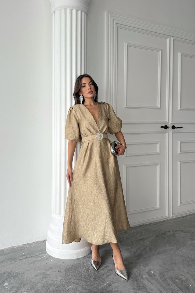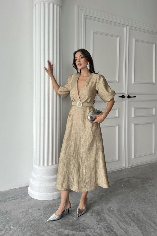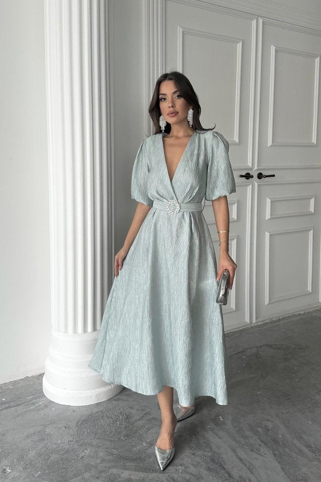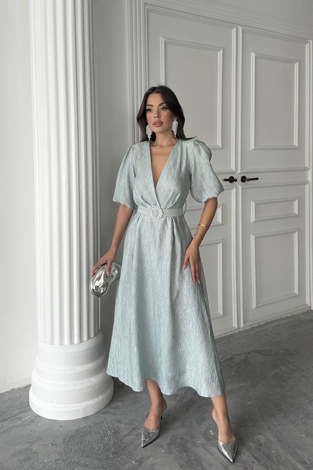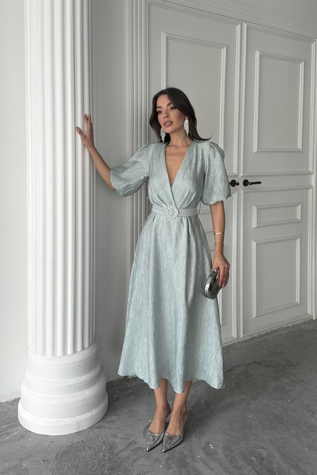 Mint Işıltılı Kemerli Kruvaze Elbise
