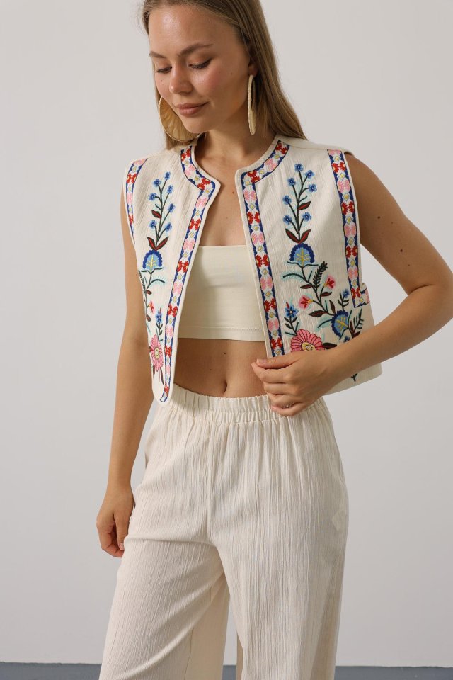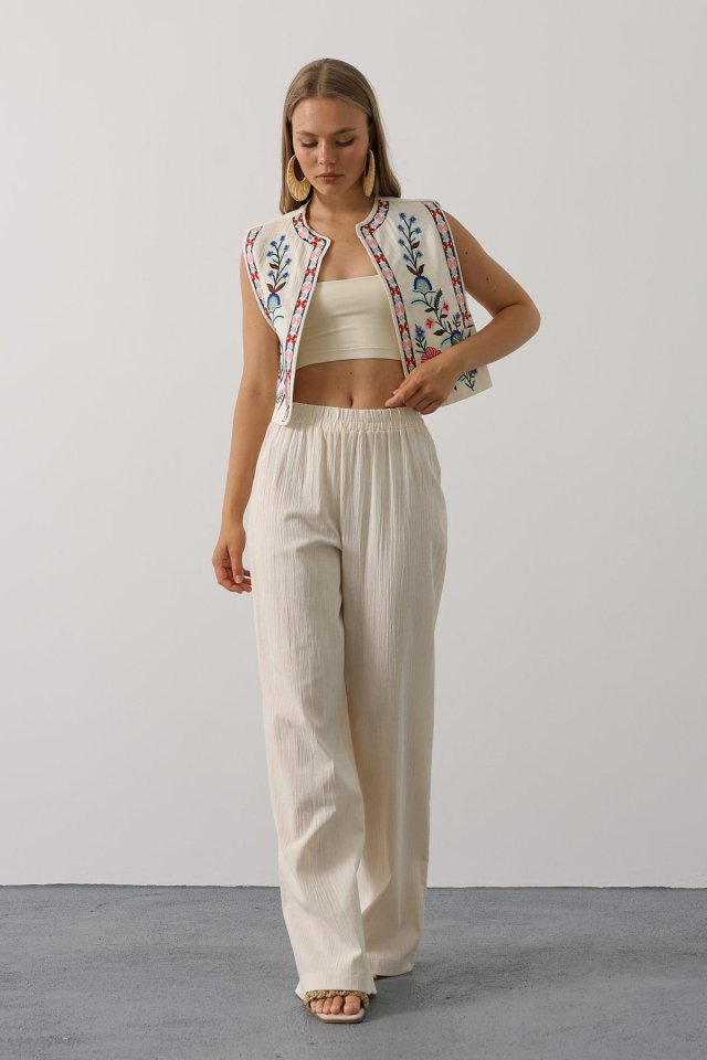 Nakışlı Yelek Pantolon Takım - Natür