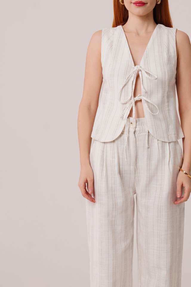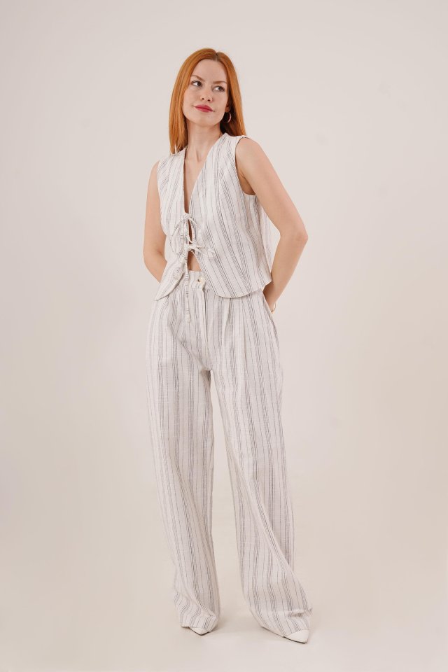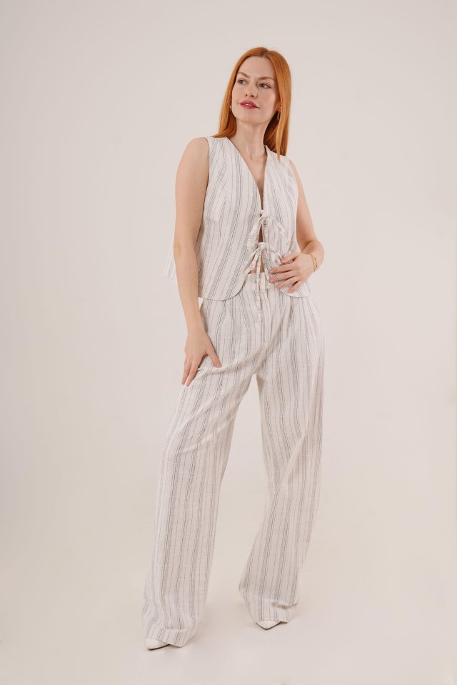 Ön Bağlama Detaylı Yelek Ve Pantolon Ekru Çizgili İkili Takım