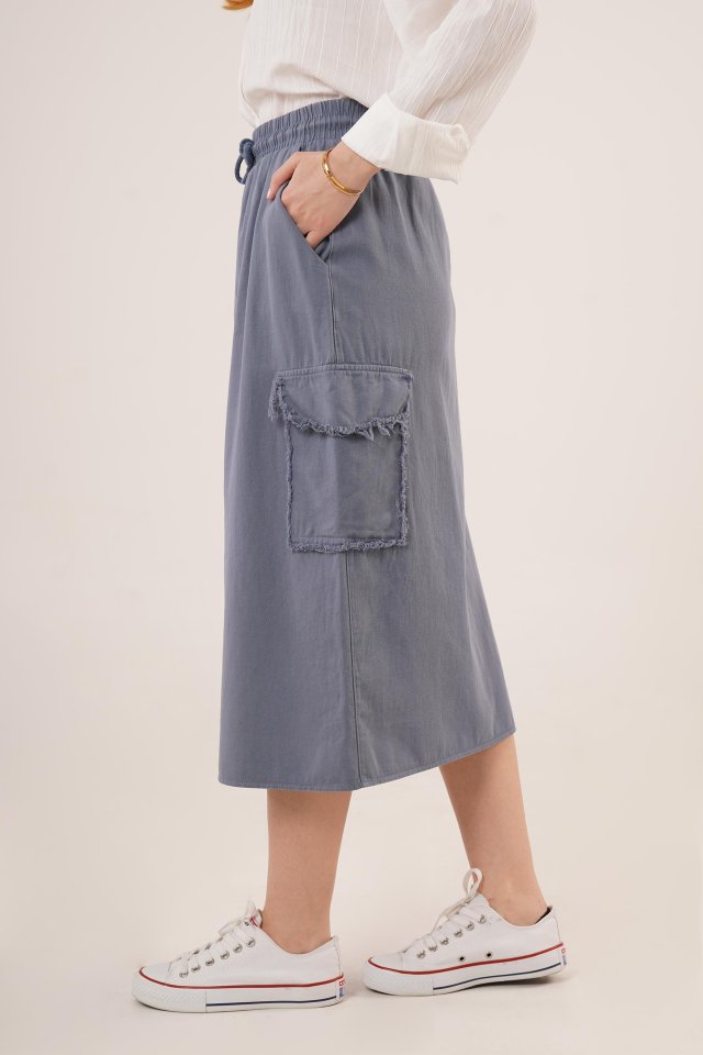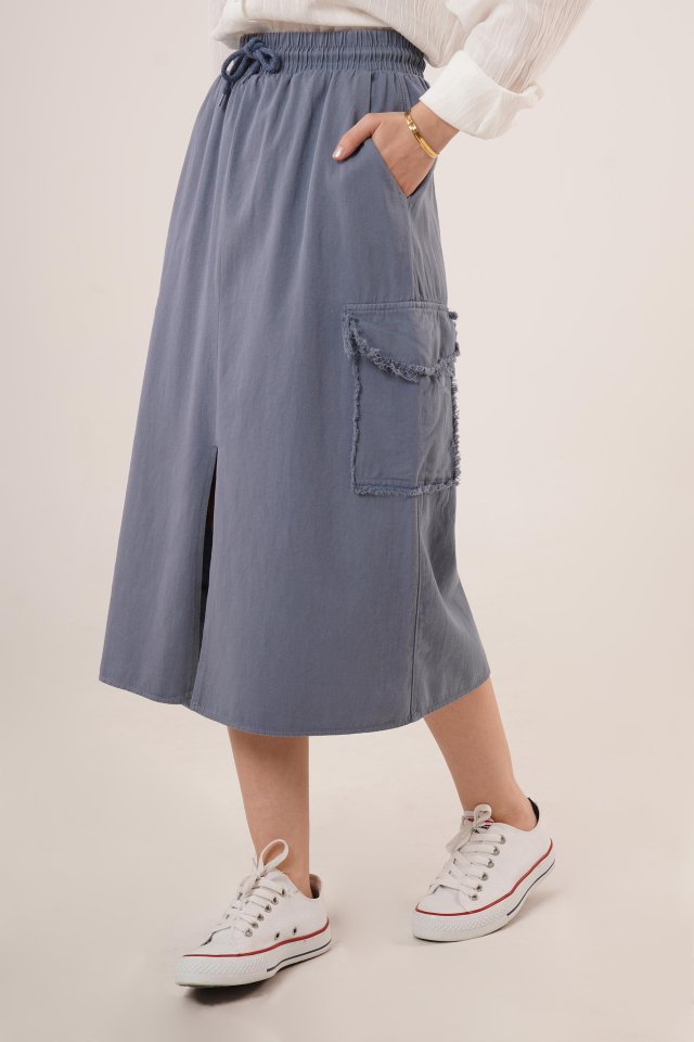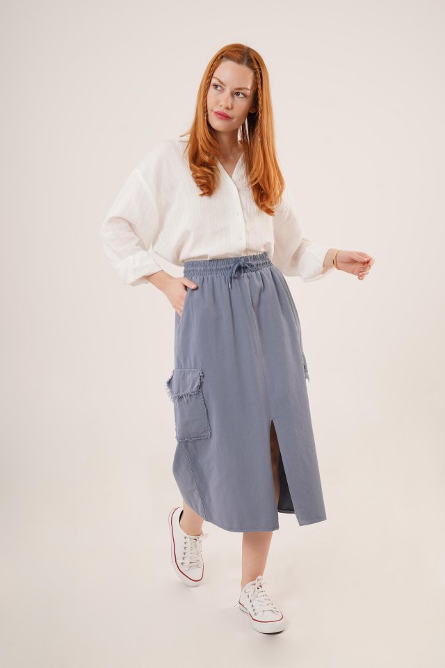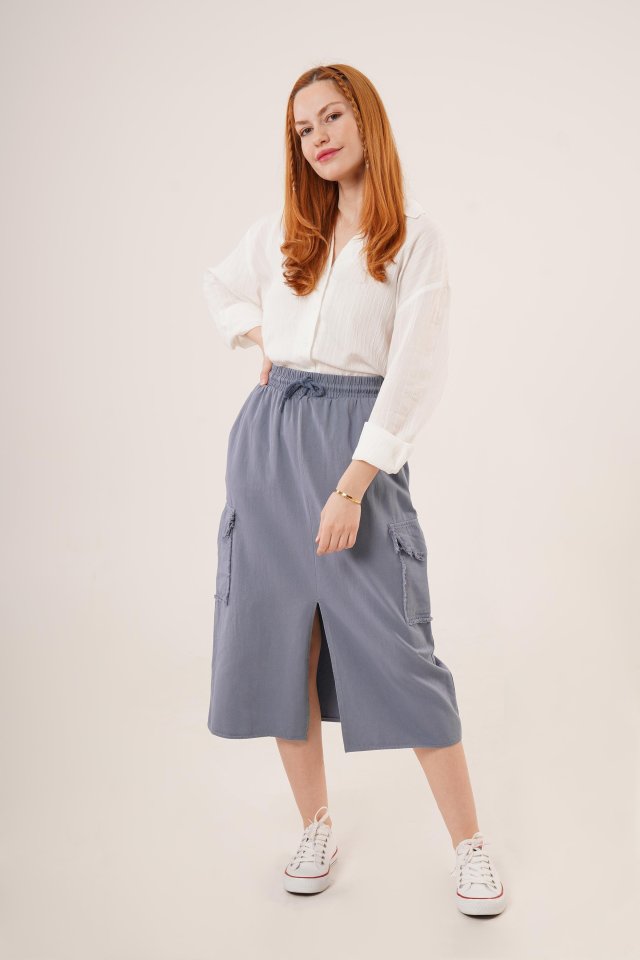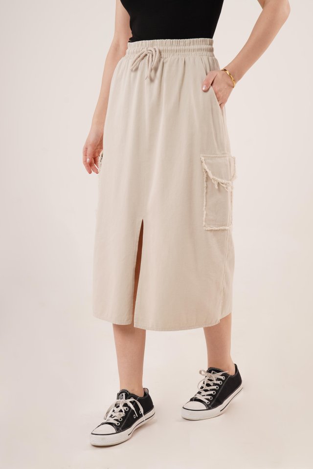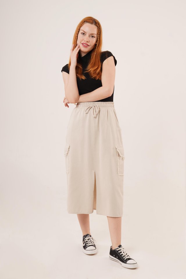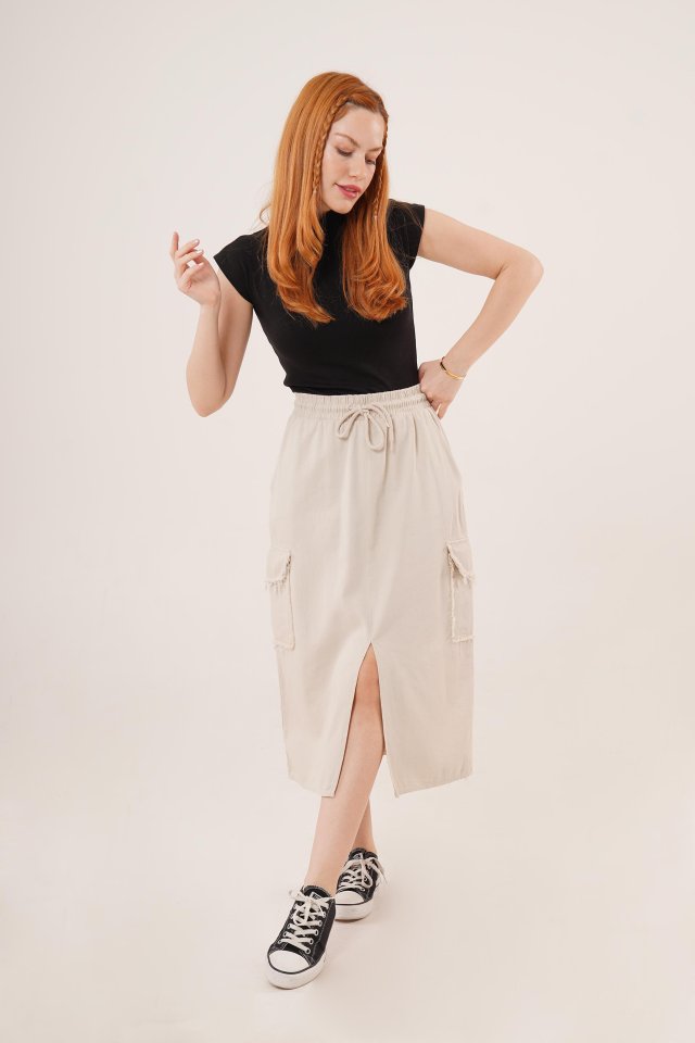 Ön Yırtmaçlı Cep Detaylı Krem Etek