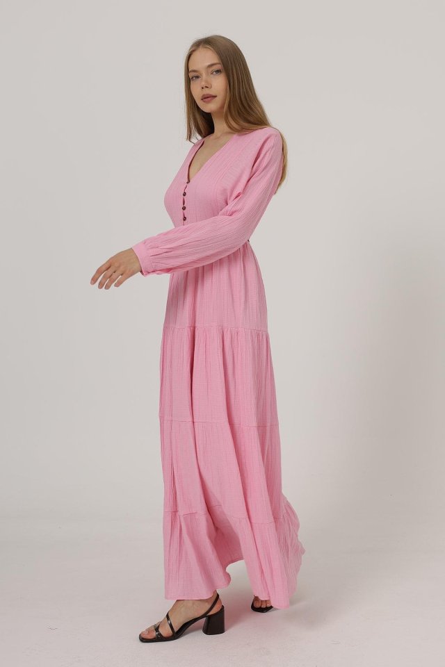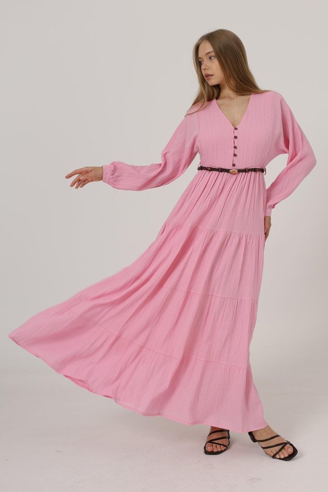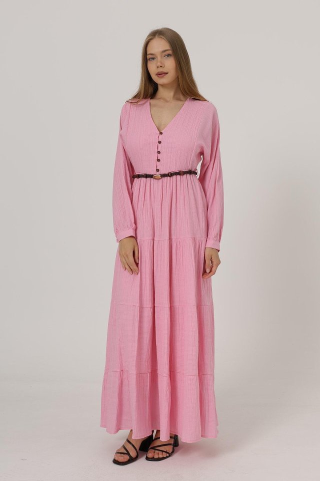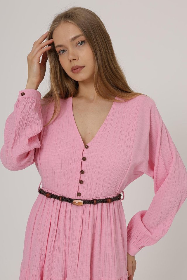 Önü Yarım Düğmeli Uzun Kol Kemerli Elbise - Pembe