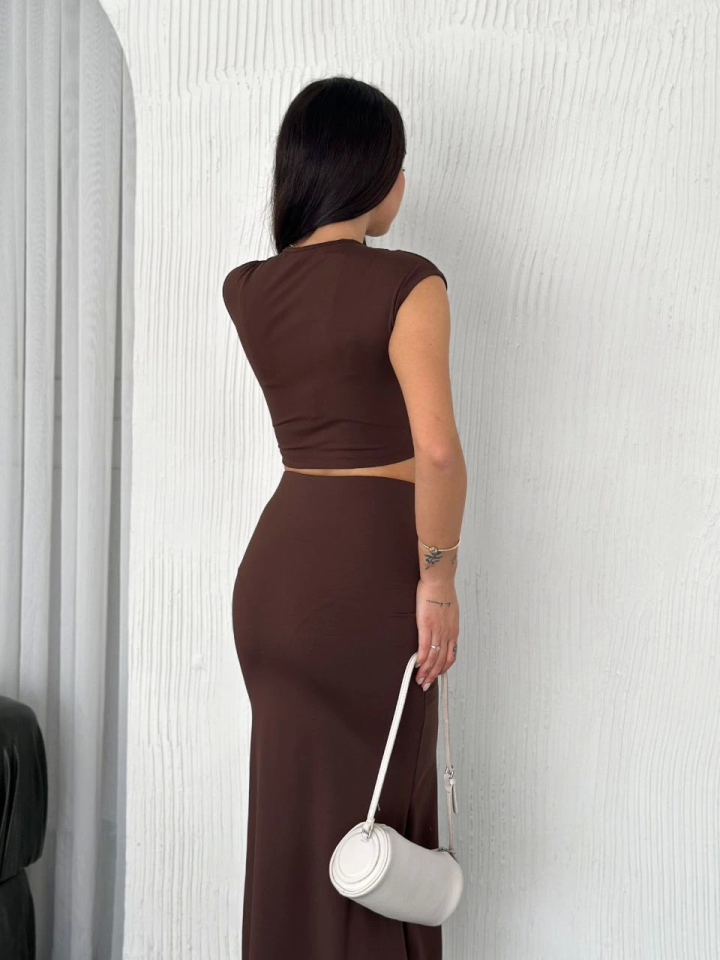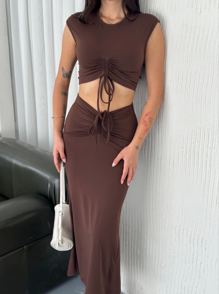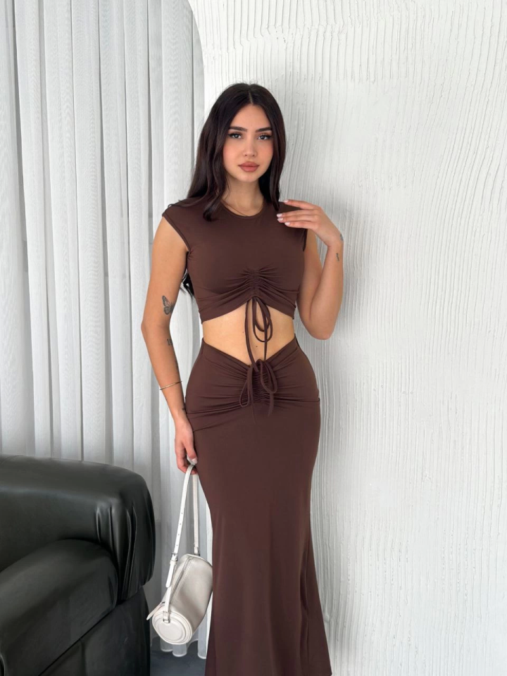 Osy Modal Yumuşak Dokulu Kumaş Büzgülü Crop Etek Takım -Kahverengi