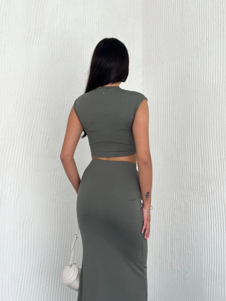 Osy Modal Yumuşak Dokulu Kumaş Büzgülü Crop Etek Takım - Mint Yeşili