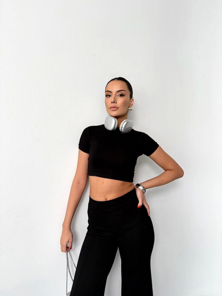 Osy Modal Yumuşak Dokulu Kumaş Kısa Kollu Crop Alt Ispanyol Paça Pantalon Ikili Takım - Siyah