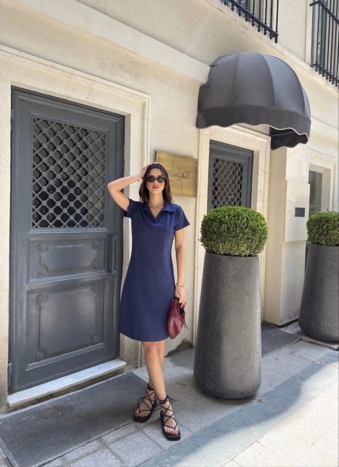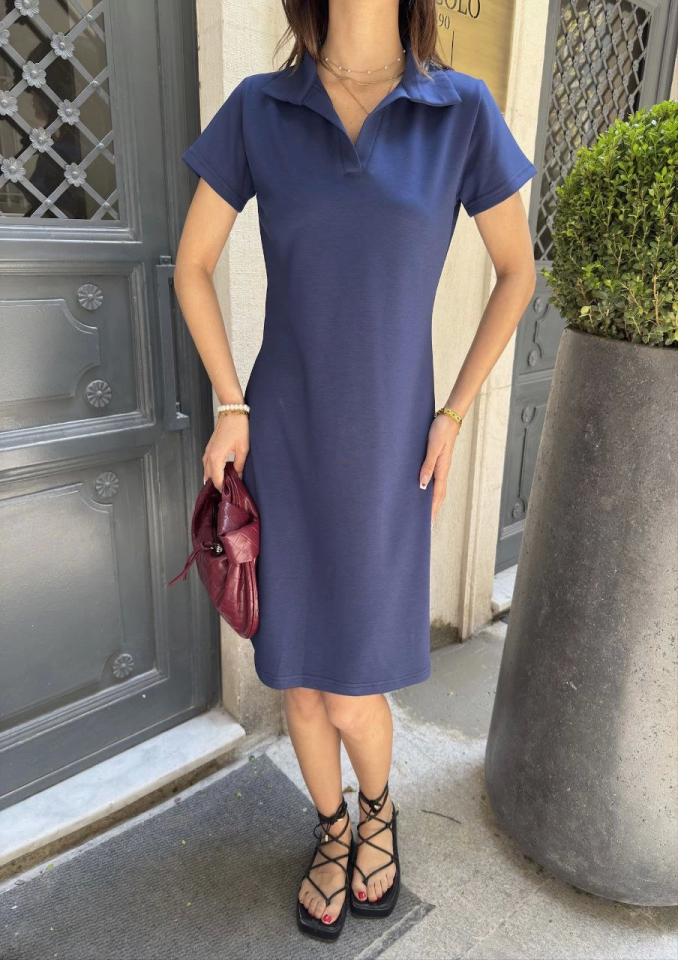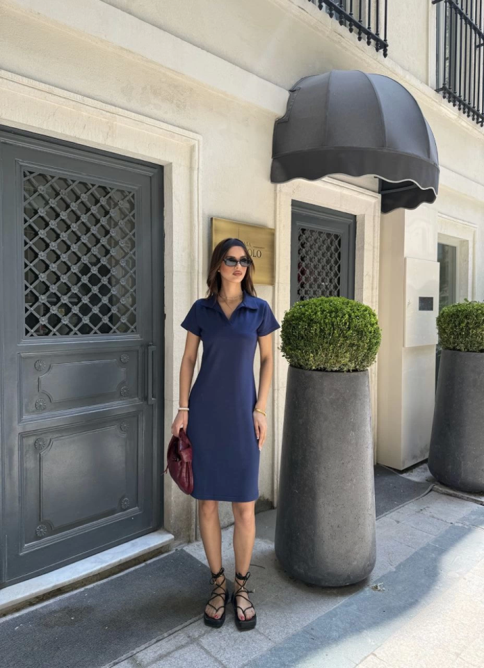 Osy Modal Yumuşak Dokulu Kumaş Yakalı Kısa Kollu Elbise - Mavi