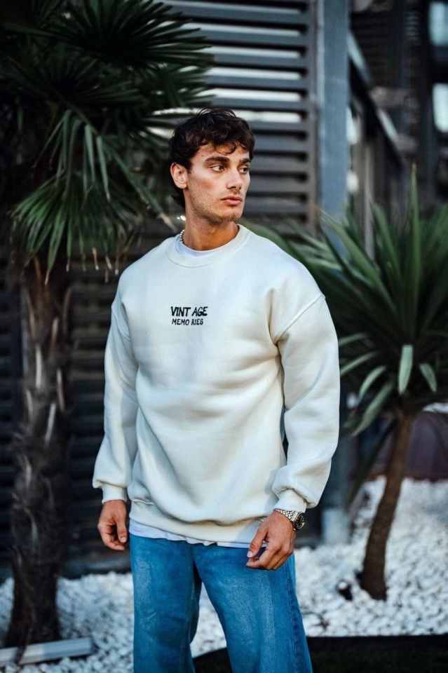 Oversize Bisiklet Yaka Üç İplik Baskılı SweatShirt - Beyaz