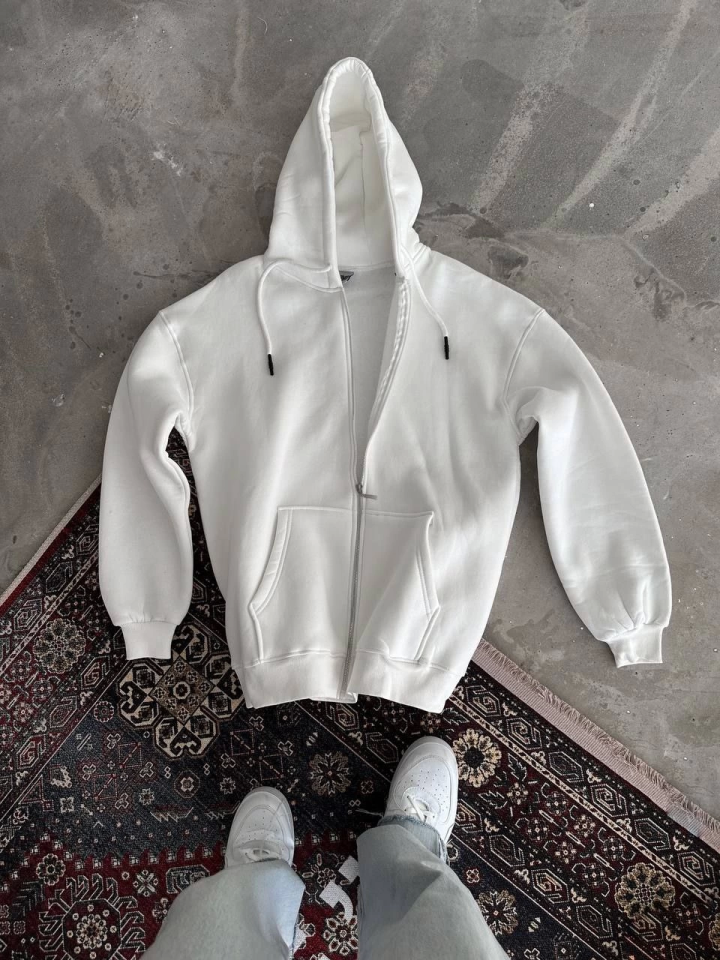 Oversize Tam Fermuarlı Uzun Kol Hırka - Beyaz